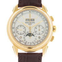 Yellow gold-tone 18kt yellow gold case with a brown alligator band. Fixed yellow gold-tone 18kt yellow gold bezel. White dial with yellow gold-tone hands and Arabic numeral hour markers. Minute markers around the outer rim. Dial Type: Analog. Perpetual calendar. Three sub-dials displaying: 60 second, 30 minute and date/moonphase. Patek Philippe Calibre CH 29-535 PS Q Hand Wind movement, containing 34 Jewels, composed of 496 parts, bitting at 28800 vph, and has a power reserve of approximately 65 hours. Scratch resistant sapphire crystal. Screw down crown. Transparent see through case back. Round case shape, case size: 41 mm. Water resistant at 30 meters / 100 feet. Functions: perpetual calendar, moon phase, chronograph, column wheel, leap year, month, date, day, hour, minute, small second, day/night indicator. Grand Complications Series. Luxury watch style. Watch label: Swiss Made. Patek Philippe Grand Complications Perpetual Chronograph Hand Wind White Dial Unisex Watch 5270J-001. INFORMATION Brand: Patek Philippe Series: Grand Complications Collection Name: Grand Complications Gender: Mens Model: 5270J-001 Watch Label: Swiss Made Movement: Hand Wind Engine: Patek Philippe Calibre CH 29-535 PS Q Power Reserve: 65 hours CASE Case Size: 41 mm Case Material: 18kt Yellow Gold Case Shape: Round Case Back: Transparent See Through BAND Band Material: Alligator Band Type: Strap Band Color: Brown DIAL Dial Color: White Type: Analog Crystal: Scratch Resistant Sapphire Hands: Yellow Gold-tone Dial Markers: Arabic Numeral Second Markers: Minute Markers around the outer rim Sub Dials: Three - 60 Second, 30 Minute and Date/Moonphase Bezel: Fixed Bezel Color: Yellow Gold-tone Bezel Material: 18kt Yellow Gold Crown: Screw Down FEATURES Water Resistance: 30 meters / 100 feet Calendar: Perpetual Calendar Functions: Perpetual Calendar, Moon Phase, Chronograph, Column Wheel, Leap Year, Month, Date, Day, Hour, Minute, Small Second, Day/Night Indicator Watch Features: Alligator Leather, Analog, Day/Night Indicator, Leap Year Indicator, Month, Perpetual, Gold, Moon Phase, Chronograph ADDITIONAL INFO Watch Style: Luxury Warranty: 2 Year Jomashop Warranty Jomashop Sku: PK-5270J001 Department: Watches Category: Watches