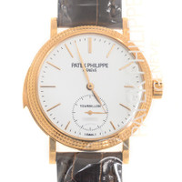Rose gold-tone 18kt rose gold case with a brown alligator band. Fixed rose gold-tone 18kt rose gold bezel. White dial with rose gold-tone hands and index hour markers. Minute markers around the outer rim. Dial Type: Analog. Hand wind movement. Scratch resistant sapphire crystal. Transparent see through case back. Round case shape, case size: 39 mm. Water resistant at 30 meters / 100 feet. Functions: hour, minute, tourbillon. Grand Complications Series. Luxury watch style. Watch label: Swiss Made. Patek Philippe Grand Complications Tourbillon Hand Wind White Dial Men's Watch 5339R-010. CASE Case Size: 39 Case Material: 18kt Rose Gold Case Shape: Round Case Back: Transparent See Through BAND Band Material: Alligator Band Type: Strap Band Color: Brown DIAL Dial Color: White Type: Analog Crystal: Scratch Resistant Sapphire Hands: Rose Gold-tone Dial Markers: Index Second Markers: Minute Markers around the outer rim Bezel: Fixed Bezel Color: Rose Gold-tone Bezel Material: 18kt Rose Gold INFORMATION Brand: Patek Philippe Series: Grand Complications Collection Name: Grand Complications Gender: Mens Model: 5339R-010 Watch Label: Swiss Made Movement: Hand Wind FEATURES Water Resistance: 30 meters / 100 feet Functions: Hour, Minute, Tourbillon Watch Features: Alligator Leather, Analog, Gold, Tourbillon ADDITIONAL INFO Watch Style: Luxury Warranty: 2 Year Jomashop Warranty Jomashop Sku: PK-5339R010 Department: Watches
