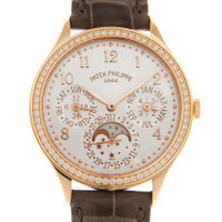 18kt rose gold case with a brown alligator leather strap. Fixed 18kt rose gold 68 diamond set (~0.68 ct) bezel. White opaline dial with rose gold-tone leaf-style hands and Arabic numeral hour markers. Minute markers around the outer rim. Dial Type: Analog. Date display at the 6 o'clock position. Three- month, day of the week, and moonphase subdials. Patek Philippe Calibre 240 Q Automatic movement, containing 27 Jewels, composed of 275 parts, bitting at 21600 vph, and has a power reserve of approximately 48 hours. Scratch resistant sapphire crystal. Pull / push crown. Skeleton transparent exhibition see through case back. Round case shape. Case size: 27.5 mm. Buckle clasp. Water resistant at 30 meters / 100 feet. Functions: leap year, month, date, day, hour, minute, second, moonphase, GMT, perpetual calendar, grand complication. Additional Info: buckle set with 27 diamonds (~0.2 ct), 24 hours at the 9 o' clock, and leap year cycle at 3 o'clock. Luxury watch style. Watch label: Swiss Made. Item Variations: 7140R 001, 7140R.001, 7140R001. Patek Philippe Grand Complications White Opaline Dial Automatic Ladies Perpetual Calendar Watch 7140R-001. INFORMATION Brand: Patek Philippe Series: Grand Complications Collection Name: Grand Complications Gender: Womens Model: 7140R-001 Watch Label: Swiss Made Movement: Automatic Engine: Patek Philippe Calibre 240 Q Power Reserve: 48 hours CASE Case Size: 27.5 mm Case Material: 18kt Rose Gold Case Shape: Round Case Back: Skeleton Transparent Exhibition See Through BAND Band Material: Alligator Leather Band Type: Strap Band Color: Brown Clasp: Buckle DIAL Dial Color: White Opaline Type: Analog Crystal: Scratch Resistant Sapphire Hands: Rose Gold-tone Leaf-style Dial Markers: Arabic Numeral Second Markers: Minute Markers around the outer rim Sub Dials: Three - Month, Day of the Week and Moonphase Bezel: Fixed Bezel Color: 18kt Rose Gold Bezel Material: 68 Diamond Set (~0.68 ct) Crown: Pull / Push FEATURES Water Resistance: 30 meters / 100 feet Calendar: Date display at the 6 o'clock position Functions: Leap Year, Month, Date, Day, Hour, Minute, Second, Moonphase, GMT, Perpetual Calendar, Grand Complication Watch Features: Alligator Leather, Analog, GMT, Leap Year Indicator, Month, Perpetual, Gold, Leather, Diamond ADDITIONAL INFO Watch Style: Luxury Warranty: 2 Year Jomashop Warranty Additional Info: buckle set with 27 diamonds (~0.2 ct), 24 hours at the 9 o' clock, and leap year cycle at 3 o'clock Jomashop Sku: PK-7140R-001 Item Variation: 7140R 001, 7140R.001, 7140R001, 7140R-001 Department: Watches Category: Watches