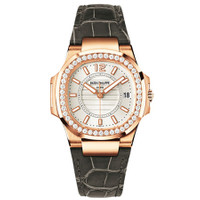 18kt rose gold case with a black alligator leather strap. Fixed 18kt rose gold 46 diamond set (~0.73 ct) bezel. White dial with gold-tone hands and index and a hour markers. Minute markers around the outer rim. Dial Type: Analog. Luminescent hands and markers. Date display at the 3 o'clock position. Patek Philippe Calibre E23-250 S C Quartz movement, containing 8 Jewels, composed of 80 parts. Scratch resistant sapphire crystal. Solid case back. Cushion case shape, case size: 32 mm, case thickness: 6.9 mm. Fold over clasp. Water resistant at 60 meters / 200 feet. Functions: date, hour, minute, second. Luxury watch style. Watch label: Swiss Made. Item Variations: 7010R 001, 7010R.001, 7010R001. Patek Philippe Nautilus White Dial Black Leather Strap Ladies Watch 7010R-001. INFORMATION Brand: Patek Philippe Series: Nautilus Collection Name: Nautilus Gender: Womens Model: 7010R-001 Watch Label: Swiss Made Movement: Quartz Engine: Patek Philippe Calibre E23-250 S C CASE Case Size: 32 mm Case Thickness: 6.9 mm Case Material: 18Kt Rose Gold Case Shape: Cushion Case Back: Solid BAND Band Material: Alligator Leather Band Type: Strap Band Color: Black Clasp: Fold Over DIAL Dial Color: White Type: Analog Crystal: Scratch Resistant Sapphire Hands: Gold-tone Dial Markers: Index and A Second Markers: Minute Markers around the outer rim Luminiscence: Hands and Markers Bezel: Fixed Bezel Color: 18Kt Rose Gold Bezel Material: 46 Diamond Set (~0.73 ct) FEATURES Water Resistance: 60 meters / 200 feet Calendar: Date display at the 3 o'clock position Functions: Date, Hour, Minute, Second Watch Features: Diamond, Leather, Gold, Analog, Alligator Leather ADDITIONAL INFO Watch Style: Luxury Warranty: 2 Year Jomashop Warranty Jomashop Sku: PK-7010R-001 Item Variation: 7010R 001, 7010R.001, 7010R001 Department: Watches Category: Watches