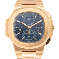 Pre-owned 18kt rose gold case with a gold-tone 18kt rose gold bracelet. Fixed 18kt rose gold bezel. Blue dial with index hour markers. Dial Type: Analog. Date display at the 12 o'clock position. Two sub-dials displaying: 60 second and date. Patek Philippe Calibre CH 28-520 C FUS Automatic movement, containing 34 Jewels, composed of 370 parts, bitting at 28800 vph, and has a power reserve of approximately 55 hours. Scratch resistant sapphire crystal. Screw down crown. Transparent see through case back. Case size: 40.5, case thickness: 12.53. Deployment clasp. Water resistant at 120 meters / 400 feet. Functions: chronograph, column wheel, date, second time zone, hour, minute, small second, day/night indicator. Additional Info: original box, international warranty card, manual (complete accessories). Nautilus Series. Luxury watch style. Watch label: Swiss Made. Patek Philippe Nautilus Chronograph Automatic Blue Dial Men's Watch 5990-1R-001. GENERAL Preowned Item Condition: Mint CASE Case Thickness: 12.53 mm Case Material: 18kt Rose Gold Case Shape: Cushion Case Back: Transparent See Through BAND Band Material: 18kt Rose Gold Band Type: Bracelet Band Color: Rose Gold-tone Clasp: Deployment DIAL Dial Color: Blue Type: Analog Crystal: Scratch Resistant Sapphire Hands: Rose Gold-tone Dial Markers: Index Second Markers: Minute Markers around the outer rim Sub Dials: Two - 60 Second and Date Luminiscence: Hands and Markers Bezel: Fixed Bezel Color: Rose Gold-tone Bezel Material: 18kt Rose Gold Crown: Screw Down INFORMATION Brand: Patek Philippe Series: Nautilus Collection Name: Nautilus Gender: Mens Model: 5990-1R-001 Watch Label: Swiss Made Movement: Automatic Engine: Patek Philippe Calibre CH 28-520 C FUS Power Reserve: 55 hours FEATURES Water Resistance: 120 meters / 400 feet Calendar: Date display at the 12 o'clock position Functions: Chronograph, Column Wheel, Date, Second Time Zone, Hour, Minute, Small Second, Day/Night Indicator Watch Features: Time Zone, Chronograph, Gold, Analog, Day/Night Indicator ADDITIONAL INFO Watch Style: Luxury Warranty: 1 Year Jomashop Warranty Jomashop Sku: PRE-P-PK-104871 Department: Watches Category: Watches