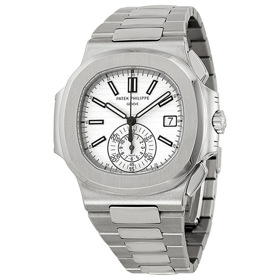 Pre-owned Silver-tone stainless steel case with a silver-tone stainless steel bracelet. Fixed silver-tone stainless steel bezel. White dial with luminous hands and index hour markers. Minute markers around the outer rim. Dial Type: Analog. Luminescent hands and markers. Date display at the 3 o'clock position. One subdial displaying: 12 hour/60 minute. Patek Philippe Calibre CH 28-520 C Automatic movement, containing 35 Jewels, composed of 327 parts, bitting at 28800 vph, and has a power reserve of approximately 55 hours. Scratch resistant sapphire crystal. Transparent see through case back. Cushion case shape, case size: 40.5 mm. Deployment clasp. Water resistant at 120 meters / 400 feet. Functions: chronograph, date, hour, minute, second. Nautilus Series. Dress watch style. Watch label: Swiss. Item Variations: 5980 1A 019, 5980.1A.019, 59801A019. Patek Philippe Nautilus Chronograph Silver Dial Steel Men's Watch 5980-1A-019. GENERAL Preowned Item Condition: Mint CASE Case Material: Stainless Steel Case Shape: Cushion Case Back: Transparent See Through BAND Band Material: Stainless Steel Band Type: Bracelet Band Color: Silver-tone Clasp: Deployment DIAL Dial Color: White Type: Analog Crystal: Scratch Resistant Sapphire Hands: Luminous Dial Markers: Index Second Markers: Minute Markers around the outer rim Sub Dials: One - 12 Hour/60 Minute Luminiscence: Hands and Markers Bezel: Fixed Bezel Color: Silver-tone Bezel Material: Stainless Steel INFORMATION Brand: Patek Philippe Series: Nautilus Collection Name: Nautilus Gender: Mens Model: 5980-1A-019 Watch Label: Swiss Movement: Automatic Engine: Patek Philippe Calibre CH 28-520 C Power Reserve: 55 hours FEATURES Water Resistance: 120 meters / 400 feet Calendar: Date display at the 3 o'clock position Functions: Chronograph, Date, Hour, Minute, Second Watch Features: Chronograph, Stainless Steel, Analog ADDITIONAL INFO Watch Style: Dress Warranty: 1 Year Jomashop Warranty Jomashop Sku: PRE-P-PK-104868 Department: Watches Category: Watches