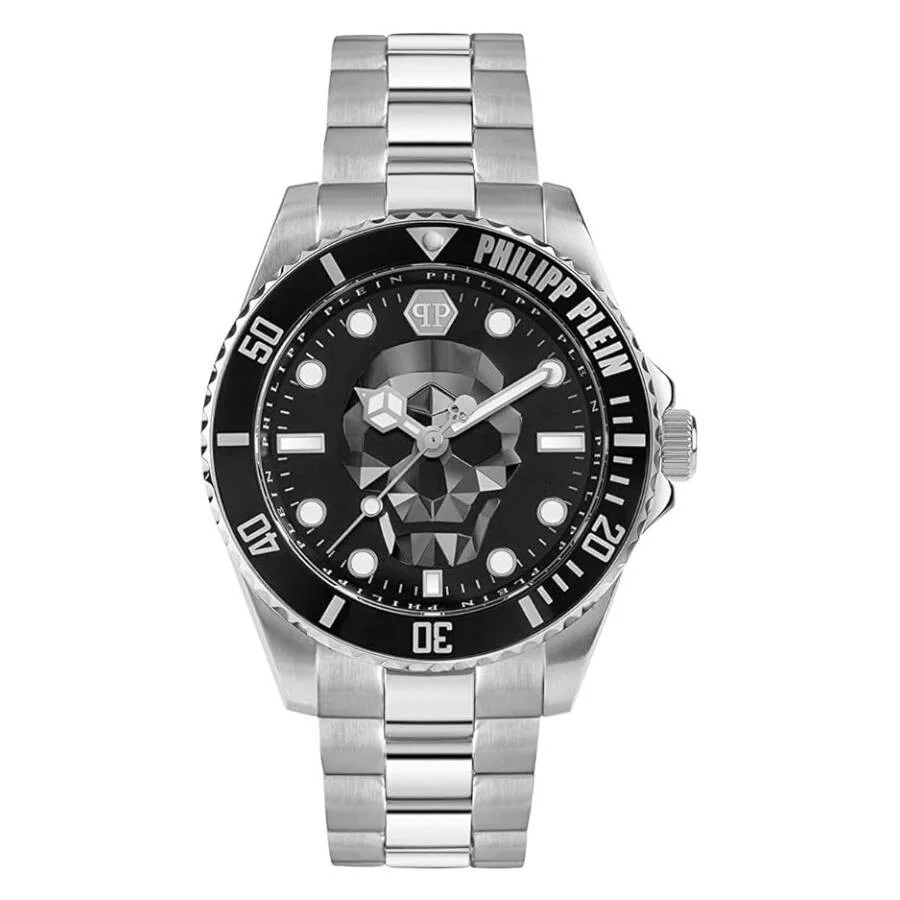 Silver-tone stainless steel case and bracelet. Uni-directional rotating black stainless steel bezel. Black dial with silver-tone hands and index hour markers. Minute markers around the outer rim. Dial Type: Analog. Luminescent hands and markers. Quartz movement. Scratch resistant mineral crystal. Solid case back. Round case shape, case size: 44 mm, case thickness: 12 mm. Water resistant at 50 meters / 165 feet. Functions: hour, minute, second. The Skull Diver Series. Casual watch style. Philipp Plein The Skull Diver Quartz Black Dial Men's Watch PWOAA0522. GENERAL Box Type: Original Box Brand Type: Designer CASE Case Thickness: 12 mm Case Material: Stainless Steel Case Shape: Round Case Back: Solid BAND Band Material: Stainless Steel Band Type: Bracelet Band Color: Silver-tone Clasp: Deployment with Push Button Release DIAL Dial Color: Black Type: Analog Crystal: Scratch Resistant Mineral Hands: Silver-tone Dial Markers: Index Second Markers: Minute Markers around the outer rim Luminiscence: Hands and Markers Bezel: Uni-directional Rotating Bezel Color: Black Bezel Material: Stainless Steel INFORMATION Brand: Philipp Plein Series: The Skull Diver Collection Name: The Skull Diver Gender: Mens Model: PWOAA0522 Movement: Quartz FEATURES Water Resistance: 50 meters / 165 feet Functions: Hour, Minute, Second Watch Features: Stainless Steel, Analog ADDITIONAL INFO Watch Style: Casual UPC Code: 7630615119274 Jomashop Sku: Z-CS5V2 Department: Watches