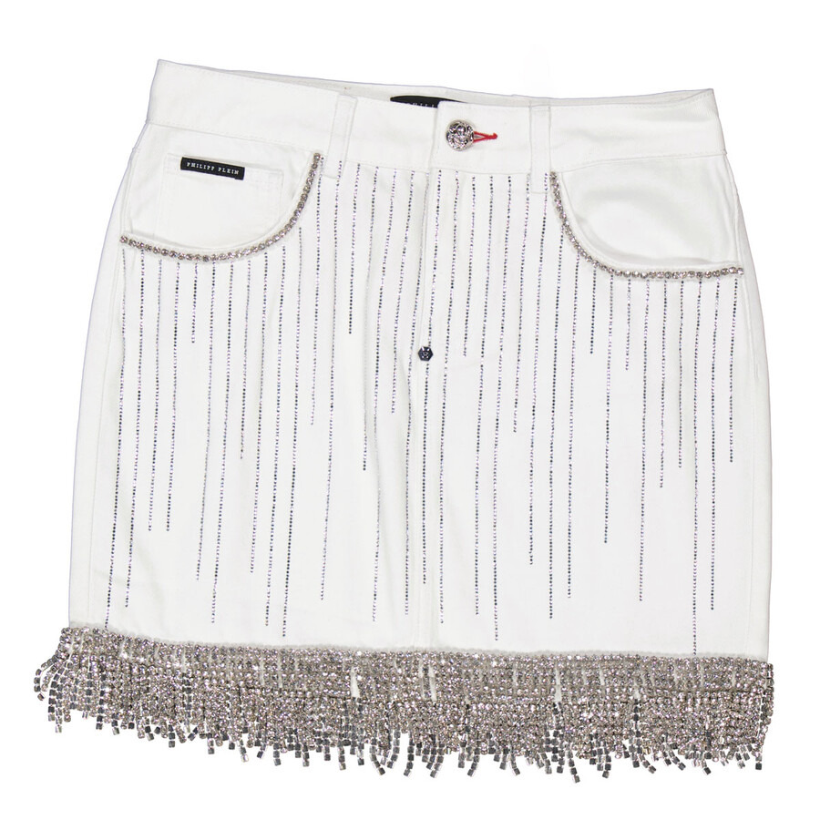 Philipp Plein Ladies Bottoms. Fashion category: Skirts. SKU: PAAC-WDV0109-PDE004N-01. Color: White. Philipp Plein White Crystal Fringe Denim Skirt. A denim miniskirt with five pockets, adorned with rhinestone fringes and applications, a single metal button fastening, and the brand's patch sewn on the back of the waistband. GENERAL Color: White INFORMATION Brand: Philipp Plein Gender: Womens Model: PAAC-WDV0109-PDE004N-01 DETAILS Category: Bottoms Apparel Type: Skirts ADDITIONAL INFO Jomashop Sku: -AACWDV0109PDE004N01 Department: Apparel
