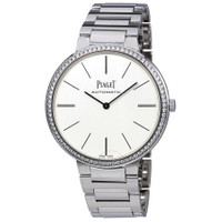 White gold case with a white gold bracelet. Fixed white gold bezel set with 78 diamonds. White dial with black hands and index hour markers. Dial Type: Analog. Piaget calibre 534P automatic movement, based upon Piaget 500P, containing 25 Jewels, composed of 196 parts, bitting at 21600 vph, and has a power reserve of approximately 42 hours. Scratch resistant sapphire crystal. Pull / push crown. Solid case back. Round case shape. Case size: 38 mm. Case thickness: 7.9 mm. Fold over clasp. Water resistant at 30 meters / 100 feet. Functions: hour, minute. Additional Info: case set with 78 diamonds (approx. 0.71 ct). Altiplano Series. Luxury watch style. Watch label: Swiss Made. Item Variations: GOA40112, G0A40112, 40112. Piaget Altiplano Automatic White Dial Ladies Watch G0A40112. INFORMATION Brand: Piaget Series: Altiplano Collection Name: Altiplano Gender: Womens Model: G0A40112 Watch Label: Swiss Made Movement: Automatic Engine: Piaget Calibre 534P Power Reserve: 42 hours CASE Case Size: 38 mm Case Thickness: 7.9 mm Case Material: White Gold Case Shape: Round Case Back: Solid BAND Band Material: White Gold Band Type: Bracelet Band Color: White Gold-tone Clasp: Fold Over DIAL Dial Color: White Type: Analog Crystal: Scratch Resistant Sapphire Hands: Black Dial Markers: Index Bezel: Fixed Bezel Material: White Gold set with Diamonds Crown: Pull / Push FEATURES Water Resistance: 30 meters / 100 feet Functions: Hour, Minute Watch Features: Diamond, Gold, Analog ADDITIONAL INFO Watch Style: Luxury Warranty: 2 Year Jomashop Warranty UPC Code: 7613268406069 Additional Info: Case set with 78 diamonds (approx. 0.71 ct). Jomashop Sku: PG-GOA40112 Item Variation: GOA40112, G0A40112, 40112 Department: Watches Category: Watches
