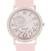 Silver-tone 18kt white gold case with a pink silk strap. Fixed 18kt white gold diamond set bezel. White dial with silver-tone hands and Arabic numeral hour markers. Dial Type: Analog. Small second subdial. Hand wind movement. Scratch resistant sapphire crystal. Solid case back. Round case shape. Case size: 34 mm. Buckle clasp. Functions: hour, minute, second. Additional Info: original box, international warranty card, manual (complete accessories). Luxury watch style. Watch label: Swiss Made. Piaget Altiplano Diamond White Dial Ladies Watch G0A31106. INFORMATION Brand: Piaget Series: Altiplano Collection Name: Altiplano Gender: Womens Model: G0A31106 Watch Label: Swiss Made Movement: Hand Wind CASE Case Size: 34 mm Case Material: 18kt White Gold Case Shape: Round Case Back: Solid BAND Band Material: Silk Band Type: Strap Band Color: Pink Clasp: Buckle DIAL Dial Color: White Type: Analog Crystal: Scratch Resistant Sapphire Hands: Silver-tone Dial Markers: Arabic Numeral Sub Dials: One - Small Second Bezel: Fixed Bezel Color: 18kt White Gold Bezel Material: Diamond Set FEATURES Functions: Hour, Minute, Second Watch Features: Diamond, Gold, Analog ADDITIONAL INFO Watch Style: Luxury Warranty: 2 Year Jomashop Warranty Additional Info: Original Box, Manual (Complete Accessories) Jomashop Sku: PG-G0A31106 Department: Watches Category: Watches