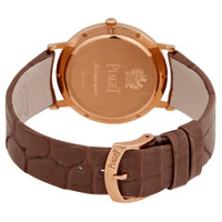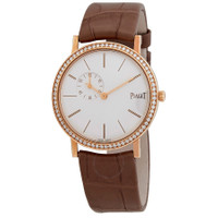18kt rose gold case with a black (alligator) leather strap. Fixed 18kt rose gold bezel set with 72 diamonds. Small seconds sub-dial at the 10 o'clock position. Piaget calibre 450P hand wind movement, containing 18 Jewels, composed of 131 parts, bitting at 21600 vph, and has a power reserve of approximately 43 hours. Scratch resistant sapphire crystal. Round case shape. Case size: 34 mm. Case thickness: 6.3 mm. Tang clasp. Water resistant at 30 meters / 100 feet. Functions: hour, minute, second. Additional Info: ). Altiplano Series. Luxury watch style. Watch label: Swiss Made. Item Variations: GOA39107, G0A39107, 39107. Piaget Altiplano White Dial 18K Rose Gold Diamond Ladies Watch GOA39107. INFORMATION Brand: Piaget Series: Altiplano Collection Name: Altiplano Gender: Womens Model: G0A39107 Watch Label: Swiss Made Movement: Hand Wind Engine: Piaget Calibre 450P Power Reserve: 43 hours CASE Case Size: 34 mm Case Thickness: 6.3 mm Case Material: 18kt Rose Gold Case Shape: Round BAND Band Material: (Alligator) Leather Band Type: Strap Band Color: Black Clasp: Tang DIAL Dial Color: White Type: Analog Crystal: Scratch Resistant Sapphire Hands: Silver-tone Dial Markers: Index Sub Dials: Small Seconds Bezel: Fixed Bezel Color: 18kt Rose Gold Bezel Material: 18kt Rose Gold set with 72 Diamonds FEATURES Water Resistance: 30 meters / 100 feet Functions: Hour, Minute, Second Watch Features: Diamond, Leather, Gold, Analog, Alligator Leather ADDITIONAL INFO Watch Style: Luxury Warranty: 2 Year Jomashop Warranty Additional Info: ) Jomashop Sku: PG-GOA39107 Item Variation: GOA39107, G0A39107, 39107 Department: Watches Category: Watches
