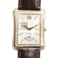 18kt rose gold case set with diamonds case with a brown alligator leather strap. Fixed 18kt rose gold bezel with diamond set. Silver dial with rose-gold tone hands and diamond-filled index hour markers. Dial Type: Analog. Two sub-dials displaying: small second and power reserve indicator. Piaget Calibre 551P Automatic movement, based upon Piaget 500P, containing 27 Jewels, composed of 225 parts, bitting at 21600 vph, and has a power reserve of approximately 42 hours. Scratch resistant sapphire crystal. Pull / push crown. Solid case back. Rectangle case shape, case size: 41 mm x 32 mm. Deployment clasp. Water resistant at 30 meters / 100 feet. Functions: hour, minute, small second, power reserve indicator. Additional Info: case set with 171 diamonds (approx. 2.1 ct). hour-markers set with 34 brilliant-cut diamonds (approx. 0.1 ct). Emperador Series. Luxury watch style. Watch label: Swiss Made. Item Variations: GOA33074, G0A33074, 33074. Piaget Emperador Silver Dial 18K Rose Gold Diamond Automatic Men's Watch G0A33074. INFORMATION Brand: Piaget Series: Emperador Collection Name: Emperador Gender: Mens Model: G0A33074 Watch Label: Swiss Made Movement: Automatic Engine: Piaget Calibre 551P Power Reserve: 42 hours CASE Case Size: 41 mm x 32 mm Case Material: 18kt Rose Gold Case Set with Diamonds Case Shape: Rectangle Case Back: Solid BAND Band Material: Alligator Leather Band Type: Strap Band Color: Brown Clasp: Deployment DIAL Dial Color: Silver Type: Analog Crystal: Scratch Resistant Sapphire Hands: Rose-Gold tone Dial Markers: Diamond-filled Index Sub Dials: Two - Small Second and Power Reserve Indicator Bezel: Fixed Bezel Color: 18kt Rose Gold Bezel Material: Diamond Set Crown: Pull / Push FEATURES Water Resistance: 30 meters / 100 feet Functions: Hour, Minute, Small Second, Power Reserve Indicator Watch Features: Alligator Leather, Analog, Power Reserve Indicator, Gold, Leather, Diamond ADDITIONAL INFO Watch Style: Luxury Warranty: 2 Year Jomashop Warranty Additional Info: Case set with 171 diamonds (approx. 2.1 ct). Hour-markers set with 34 brilliant-cut diamonds (approx. 0.1 ct) Jomashop Sku: PG-GOA33074 Item Variation: GOA33074, G0A33074, 33074 Department: Watches Category: Watches