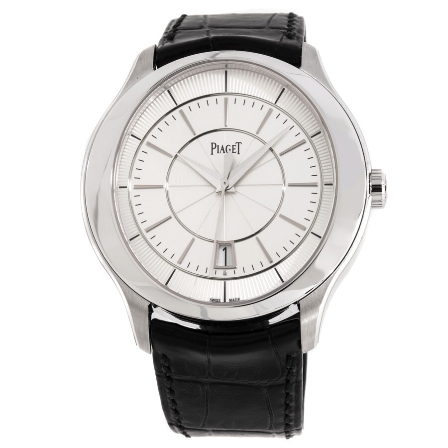 . 18kt white gold case with a black (alligator) leather strap. Fixed 18kt white gold bezel. Silver dial with silver-tone dauphine-style hands and index hour markers. Minute markers around an inner ring. Dial Type: Analog. Date display at the 6 o'clock position. Piaget calibre 800P automatic movement, containing 25 Jewels, composed of 201 parts, bitting at 21600 vph, and has a power reserve of approximately 85 hours. Scratch resistant sapphire crystal. Pull / push crown. Round case shape. Case size: 43 mm. Ccase thickness: 9 mm. Water resistant at 30 meters / 100 feet. Functions: date, hour, minute, second. Gouverneur Series. Luxury watch style. Watch label: Swiss Made. Item Variations: GOA38110, G0A38110, 38110. Piaget Gouverneur Silver Dial 18K White Gold Men's Watch GOA38110. CASE Case Size: 43 Case Thickness: 9 mm Case Material: 18kt White Gold Case Shape: Round BAND Band Material: (Alligator) Leather Band Type: Strap Band Color: Black DIAL Dial Color: Silver Type: Analog Crystal: Scratch Resistant Sapphire Hands: Silver-tone Dauphine-style Dial Markers: Index Second Markers: Minute Markers around an inner ring Bezel: Fixed Bezel Material: 18kt White Gold Crown: Pull / Push INFORMATION Brand: Piaget Series: Gouverneur Collection Name: Gouverneur Gender: Mens Model: G0A38110 Watch Label: Swiss Made Movement: Automatic Engine: Piaget Calibre 800P Power Reserve: 85 hours FEATURES Water Resistance: 30 meters / 100 feet Calendar: Date display at the 6 o'clock position Functions: Date, Hour, Minute, Second Watch Features: Leather, Gold, Analog, Alligator Leather ADDITIONAL INFO Watch Style: Luxury Warranty: 2 Year Jomashop Warranty Jomashop Sku: PG-GOA38110 Item Variation: GOA38110, G0A38110, 38110 Department: Watches Category: Watches