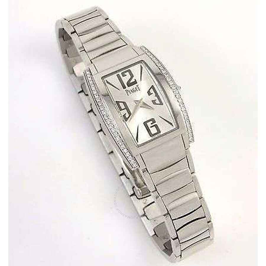 18k white gold case set with diamonds case with a 18k white gold bracelet. Fixed bezel. Silver dial with silver-toned hands and index and Arabic numeral hour markers. Dial Type: Analog. Quartz movement. 57p engine. Scratch resistant sapphire crystal. Case diameter: 22 mm x 30 mm. Tonneau case shape. Deployment clasp. Water resistant at 30 meters / 100 feet. Functions: hour, minute. Additional Info: case in 18k white gold set with 50 brilliant-cut diamonds (approx. 0.3 ct). crown set with a brilliant-cut diamond (approx. 0.1 ct). Luxury watch style. Watch label: Swiss Made. Item Variations: GOA36095 , A36095 , 36095. Piaget Limelight Silver Dial 18K White Gold Diamond Ladies Watch GOA36095. INFORMATION Brand: Piaget Series: Limelight Collection Name: Limelight Gender: Womens Model: G0A36095 Watch Label: Swiss Made Movement: Quartz Engine: Piaget Calibre 57P CASE Case Size: 30 mm x 22 mm Case Material: 18kt White Gold Case Set with Diamonds Case Shape: Tonneau BAND Band Material: 18kt White Gold Band Type: Bracelet Band Color: White Gold-tone Clasp: Deployment DIAL Dial Color: Silver Type: Analog Crystal: Scratch Resistant Sapphire Hands: Silver-toned Dial Markers: Index and Arabic Numeral Bezel: Fixed Bezel Color: 18kt White Gold Bezel Material: Diamond Set FEATURES Water Resistance: 30 meters / 100 feet Functions: Hour, Minute Watch Features: Diamond, Gold, Analog ADDITIONAL INFO Watch Style: Luxury Warranty: 2 Year Jomashop Warranty Additional Info: Case in 18K white gold set with 50 brilliant-cut diamonds (approx. 0.3 ct). Crown set with a brilliant-cut diamond (approx. 0.1 ct) Jomashop Sku: PG-GOA36095 Item Variation: GOA36095 , A36095 , 36095 Department: Watches Category: Watches