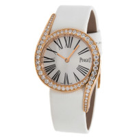 18kt rose gold case with a white satin bracelet. Fixed bezel set with diamonds bezel. Silver dial with gold-toned hands and Roman numeral hour markers. Dial Type: Analog. Quartz movement. Scratch resistant sapphire crystal. Case diameter: 32 mm. Case thickness: 7.4 mm. Round case shape. Tang clasp. Water resistant at 30 meters / 100 feet. Functions: hour, minute. Luxury watch style. Watch label: Swiss Made. Piaget Limelight Silver Dial 18kt Rose Gold Diamond Ladies Watch GOA38161. INFORMATION Brand: Piaget Series: Limelight Collection Name: Limelight Gender: Womens Model: G0A38161 Watch Label: Swiss Made Movement: Quartz CASE Case Size: 32 mm Case Thickness: 7.4 mm Case Material: 18kt Rose Gold Case Shape: Round BAND Band Material: Satin Band Type: Strap Band Color: White Clasp: Tang DIAL Dial Color: Silver Type: Analog Crystal: Scratch Resistant Sapphire Hands: Gold-toned Dial Markers: Roman Numeral Bezel: Fixed Bezel Material: Diamond Set FEATURES Water Resistance: 30 meters / 100 feet Functions: Hour, Minute Watch Features: Diamond, Gold, Analog ADDITIONAL INFO Watch Style: Luxury Warranty: 2 Year Jomashop Warranty Jomashop Sku: PG-GOA38161 Item Variation: GOA38161 , A38161 , 38161 Department: Watches Category: Watches