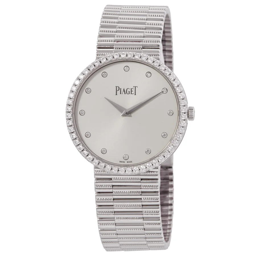 18k white gold case with a 18k white gold bracelet. Fixed bezel set with diamonds bezel. Silver dial with silver-toned hands and diamond hour markers. Dial Type: Analog. Hand wind movement. Scratch resistant sapphire crystal. Pull / push crown. Case diameter: 34 mm. Case thickness: 5.2 mm. Round case shape. Water resistant at 30 meters / 100 feet. Functions: hour, minute. Additional Info: case with diamonds (approx. 0.8 ct). dial with diamond hour-markers (approx. 0.1 ct). Luxury watch style. Watch label: Swiss Made. Item Variations: GOA37045, G0A37045, 37045. Piaget Traditional Silver Dial 18K White Gold Ladies Watch GOA37045. GENERAL Box Type: Original Box CASE Case Diameter: 34 mm Case Thickness: 5.2 mm Case Material: 18kt White Gold Case Shape: Round BAND Band Material: 18kt White Gold Band Type: Bracelet Band Color: White Gold-tone DIAL Dial Color: Silver Type: Analog Crystal: Scratch Resistant Sapphire Hands: Silver-toned Dial Markers: Diamond Bezel: Fixed Bezel Material: Diamond Set Crown: Pull / Push INFORMATION Brand: Piaget Series: Traditional Collection Name: Traditional Gender: Womens Model: G0A37045 Watch Label: Swiss Made Movement: Hand Wind Engine: Piaget Calibre 430P Power Reserve: 43 hours FEATURES Water Resistance: 30 meters / 100 feet Functions: Hour, Minute Watch Features: Analog, Gold, Diamond ADDITIONAL INFO Watch Style: Luxury Warranty: 2 Year Jomashop Warranty Additional Info: Case with diamonds (approx. 0.8 ct). Dial with diamond hour-markers (approx. 0.1 ct) Jomashop Sku: PG-GOA37045 Item Variation: GOA37045, G0A37045, 37045 Department: Watches Category: Watches