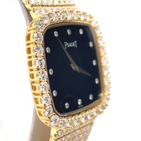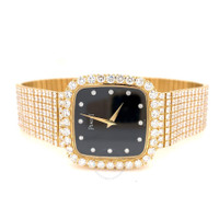 Yellow gold-tone 18kt yellow gold case with a yellow gold-tone diamond set 18kt yellow gold bracelet. Fixed yellow gold-tone bezel with diamond set 18kt yellow gold. Black dial with yellow gold-tone hands and diamond hour markers. Dial Type: Analog. Quartz movement. Scratch resistant sapphire crystal. Pull / push crown. Solid case back. Cushion case shape, case size: 30 mm, case thickness: 7 mm. Band width: 18 mm. Fold over clasp. Water resistant at 30 meters / 100 feet. Functions: hour, minute. Vintage Series. Luxury watch style. Watch label: Swiss Made. Pre-owned Piaget Vintage Quartz Diamond Black Dial Ladies Watch 463093. GENERAL Collection Name: Vintage INFORMATION Brand: Piaget Series: Vintage Model: 463093 Gender: Womens Watch Label: Swiss Made Movement: Quartz CONDITION INFORMATION Box: No Preowned Item Condition: Excellent Papers: No CASE Case Size: 30 mm Case Thickness: 7 mm Case Material: 18kt Yellow Gold Case Shape: Cushion Case Back: Solid DIAL Type: Analog Dial Color: Black Crystal: Scratch Resistant Sapphire Hands: Yellow Gold-tone Dial Markers: Diamond Bezel: Fixed Bezel Color: Yellow Gold-tone Bezel Material: Diamond Set 18kt Yellow Gold Crown: Pull / Push BAND Band Type: Bracelet Band Material: Diamond Set 18kt Yellow Gold Band Color: Yellow Gold-tone Band Width: 18 mm Clasp: Fold Over FEATURES Water Resistance: 30 meters / 100 feet Functions: Hour, Minute Watch Features: Diamond, Gold, Analog ADDITIONAL INFO Watch Style: Luxury Warranty: 1 Year Jomashop Warranty Jomashop Sku: PRE-P-PG-61149 Department: Watches Category: Watches