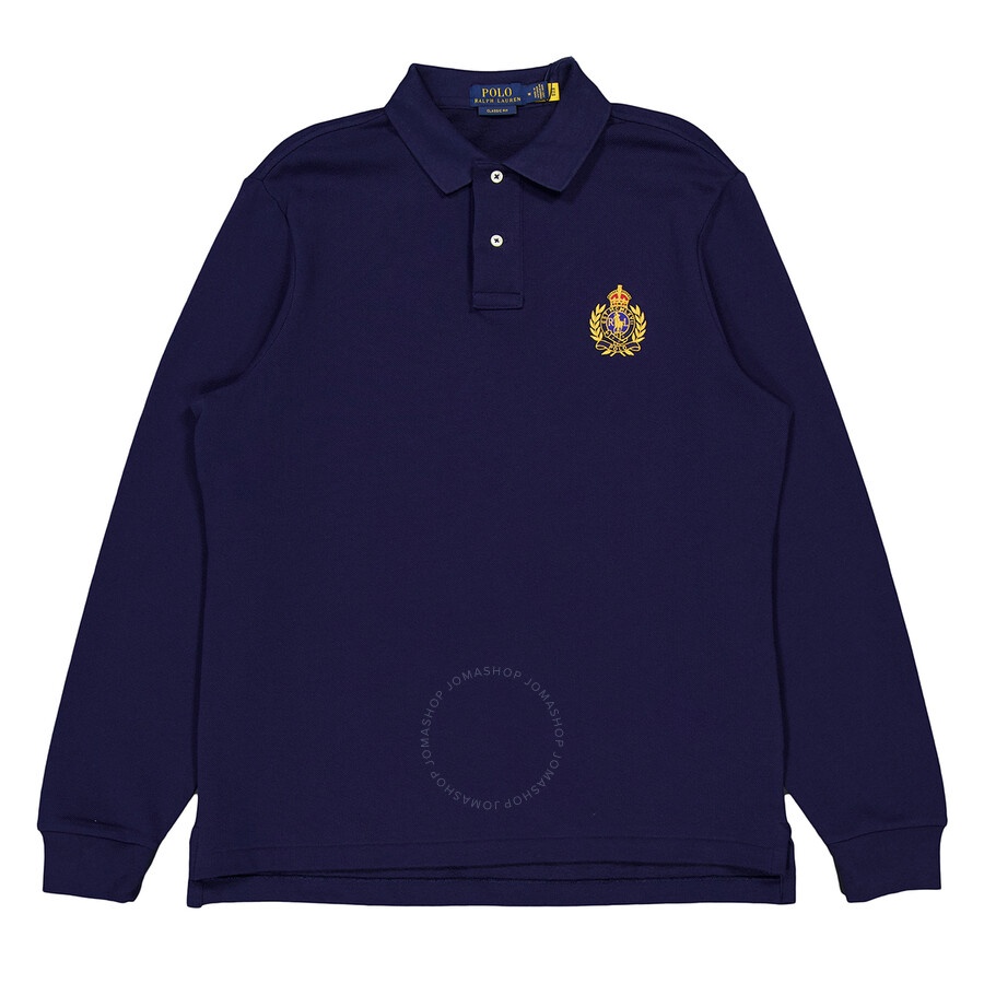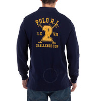 Polo Ralph Lauren Men's Tops. Fashion category: Polo Shirts. SKU: 710917797001. Color: Navy. Polo Ralph Lauren Navy Big Pony Polo Crest Long Sleeve Polo. This long sleeve polo shirt features an embroidered Polo Crest on the left chest, with "Polo R.L.," "LX VII," "Challenge Cup," the signature Big Pony, and "2" appliqued and embroidered on the back, along with a ribbed Polo collar, a two-button placket, and a tennis tail. Material: 93% Cotton, 7% Polyester. INFORMATION Brand: Polo Ralph Lauren Gender: Mens Model: 710917797001 DETAILS Category: Tops Apparel Type: Polo Shirts Material: Cotton, Polyester ADDITIONAL INFO Jomashop Sku: -POLO710917797001 Department: Clothing