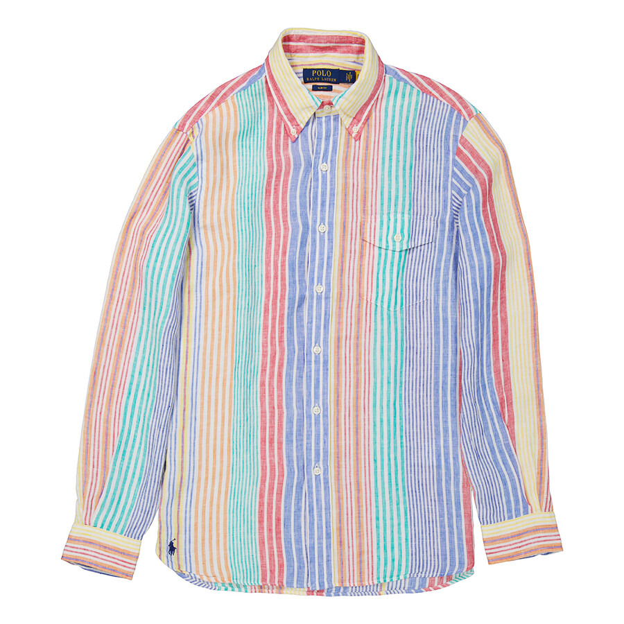 Polo Ralph Lauren Men's Tops. SKU: 710867332001. Color: Blue/Red/Multi. Polo Ralph Lauren Men's Blue / Red / Multi Vertical-Striped Shirt. A linen shirt featuring long sleeves with buttoned cuffs, front button fastening, straight-point collar, curved hem and vertical stripe pattern. Linen/Flax 100% GENERAL Color: Blue/Red/Multi INFORMATION Brand: Polo Ralph Lauren Gender: Mens Model: 710867332001 DETAILS Category: Tops Apparel Type: Casual Button-Downs ADDITIONAL INFO Jomashop Sku: -710867332001N Department: Apparel