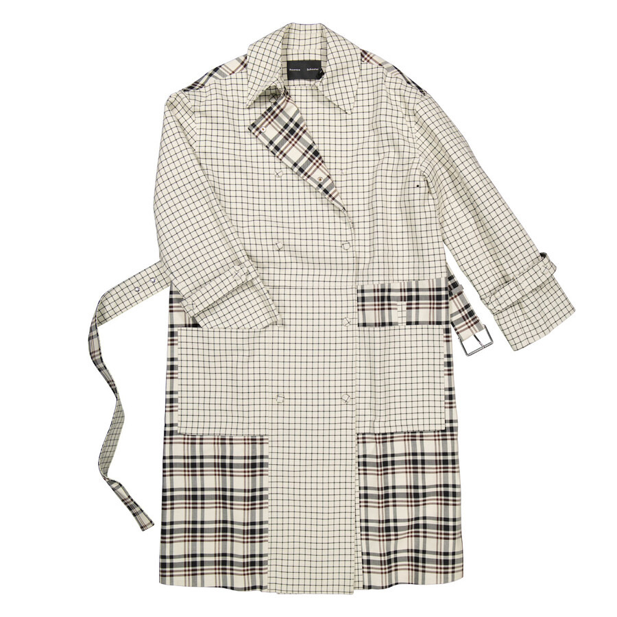 Proenza Schouler Ladies Outerwear. Fashion category: Coats & Jackets. SKU: R2011002-22052. Color: Ecru/Black Windowpane. Proenza Schouler Ladies Windowpane Plaid Belted Trench Coat. A belted trench with a point collar, plaid prints, long sleeves with belted cuffs, a double-breasted front closure and a woven construction. Materials - Shell: 43% polyester, 28% polyester, 23% viscose, 6% polyurethane. Trim: 43% polyester, 28% polyester, 23% polyester, 6% polyurethane. Lining: 100% cotton. Made in Italy. GENERAL Color: Ecru/Black Windowpane INFORMATION Brand: Proenza Schouler Gender: Womens Model: R2011002-22052 DETAILS Category: Outerwear Apparel Type: Coats & Jackets ADDITIONAL INFO Jomashop Sku: -R201100222052 Department: Apparel