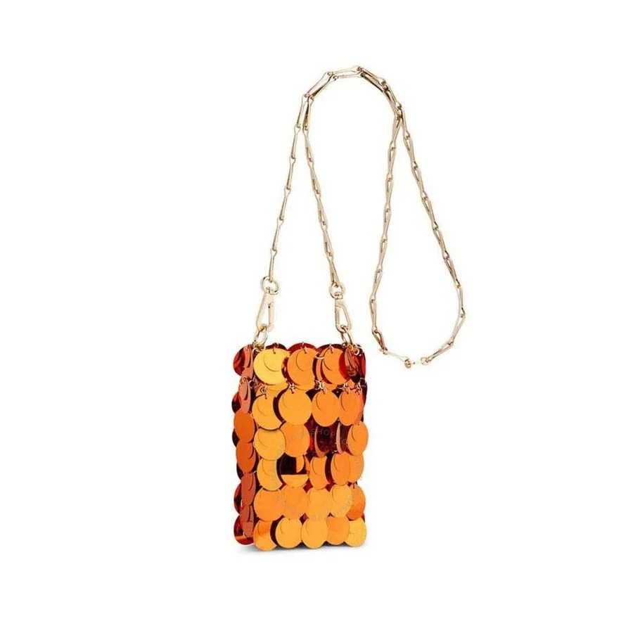 Paco Rabanne Ladies Handbag. Fashion category: Bags. SKU: 23FSS0094PLX013-P822. Color: Bright Orange. Size: H4.5 x W6.5 x D1.25. Paco Rabanne Sparkle Mini Handbag. This bag features disc detailing, an adjustable chain-link shoulder strap, an open top, a main compartment and a lined interior. Material: 90% Polyester, 10% Brass. GENERAL Size Info: H4.5 x W6.5 x D1.25 Color: Bright Orange Apparel Type: Bags INFORMATION Brand: Paco Rabanne Gender: Womens Model: 23FSS0094PLX013-P822 ADDITIONAL INFO UPC Code: 3349661030719 Jomashop Sku: Z-C8U2P Department: Bags Category: Handbag