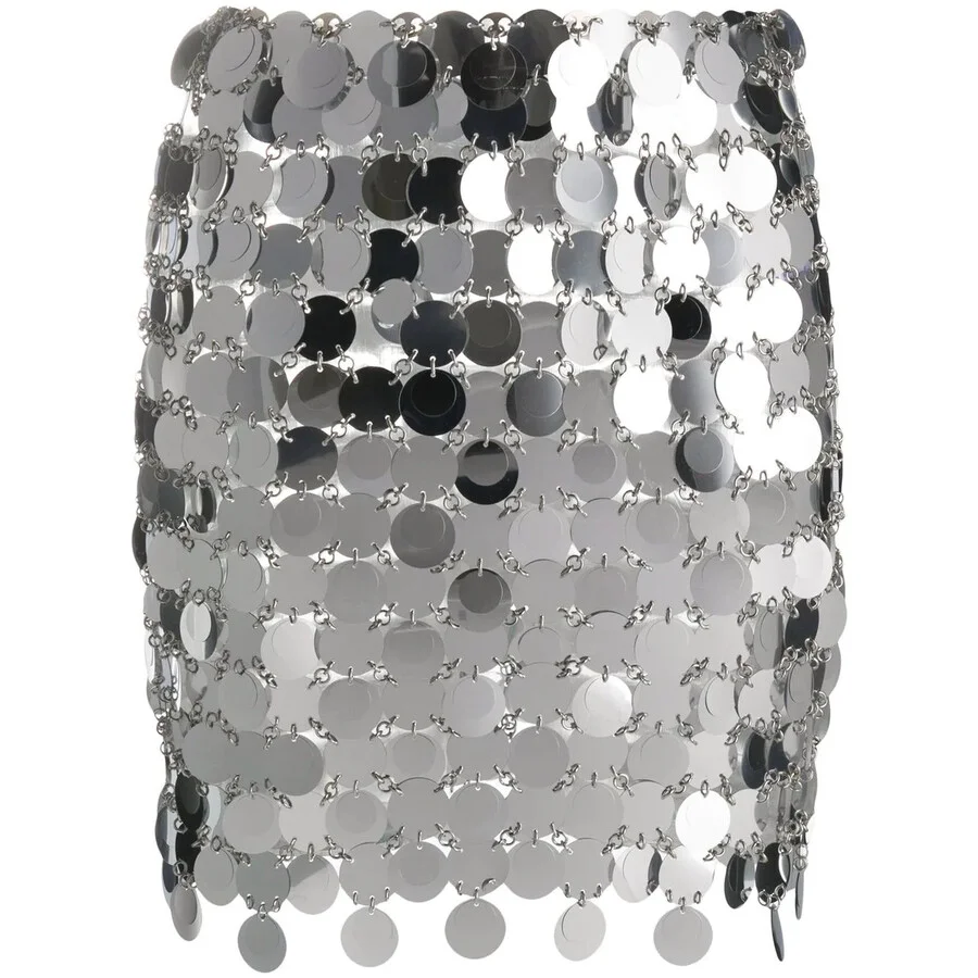 Rabanne Ladies Bottoms. Fashion category: Skirts. SKU: 19EIJU010PS0133. Color: Silver. Paco Rabanne Asymmetric Hem Mini Skirt. This dazzling mini skirt is made from shimmering silver-toned round sequins that catch the light with every movement. It boasts an edgy asymmetric hem that adds a modern twist to the classic silhouette, while the unlined design offers a sleek, minimalist finish for a bold, effortless look. GENERAL Size Info: 4 Clothing Size: Ladies Apparel Size: 4 Color: Silver INFORMATION Brand: Rabanne Gender: Womens Model: 19EIJU010PS0133-SILVER DETAILS Category: Bottoms Apparel Type: Skirts Material: Steel, Polyester ADDITIONAL INFO UPC Code: 3349660587481 Jomashop Sku: Z-2LGGP Department: Clothing