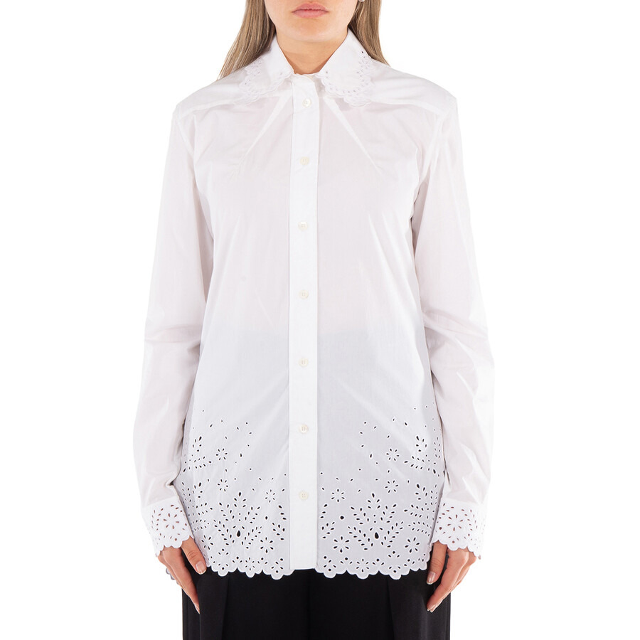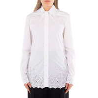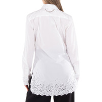 Rabanne Ladies Tops. SKU: 24ACTO872CO0511. Color: White. The Rabanne Haut Shirt blends elegance with intricate detailing. Featuring a front button fastening and cutwork detailing, it offers a refined yet modern look. Designed with long sleeves, buttoned cuffs, and a curved high-low hem, this shirt adds a sophisticated touch to any outfit. Cotton 100%. GENERAL Color: White INFORMATION Brand: Rabanne Gender: Womens Model: 24ACTO872CO0511-WHITE DETAILS Category: Tops Apparel Type: Casual Button-Downs Material: Cotton ADDITIONAL INFO Jomashop Sku: -4ACTO872CO0511WHITE Department: Clothing