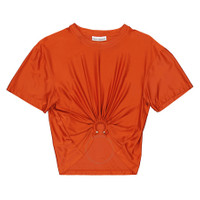 Rabanne Ladies Tops. Fashion category: T-Shirts & Henleys. SKU: 23FJTO539VI0267-P823. Color: Paprika. Rabanne Short Sleeve Knotted Cropped T Shirt. This cropped top features a round neck, short sleeves, and gathered detailing for a stylish and contemporary look. Material: Elastane 100%, Viscose 100%. GENERAL Color: Paprika INFORMATION Brand: Rabanne Gender: Womens Model: 23FJTO539VI0267-P823 DETAILS Category: Tops Apparel Type: T-Shirts & Henleys ADDITIONAL INFO Jomashop Sku: -23FJTO539VI0267P823 Department: Clothing
