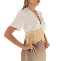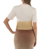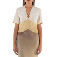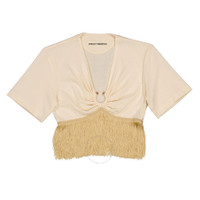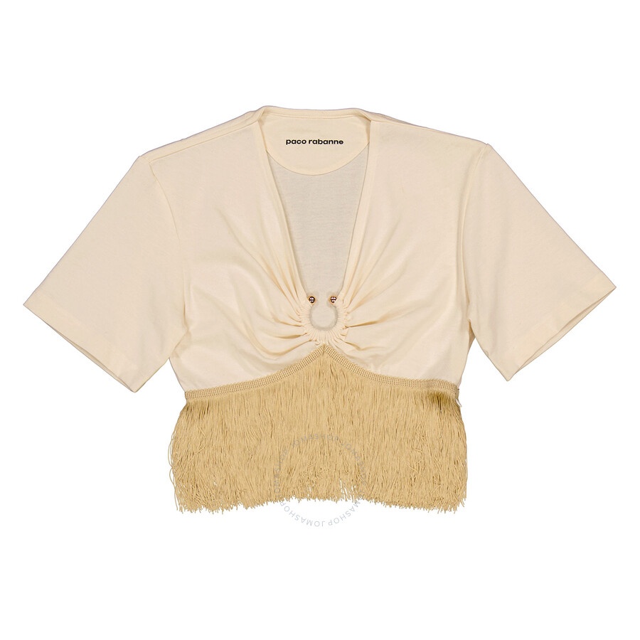 Rabanne Ladies Tops. Fashion category: T-Shirts & Henleys. SKU: 23FJTE112CO0471-P270. Color: Nude.Rabanne V Neck Fringe Detailed Top. This cropped cotton top features a V-neck, gathered detailing, short sleeves and a fringed edge. Material: Cotton 100%, Polyester 100%. GENERAL Color: Nude INFORMATION Brand: Rabanne Gender: Womens Model: 23FJTE112CO0471-P270 DETAILS Category: Tops Apparel Type: T-Shirts & Henleys ADDITIONAL INFO Jomashop Sku: -23FJTE112CO0471P270 Department: Clothing