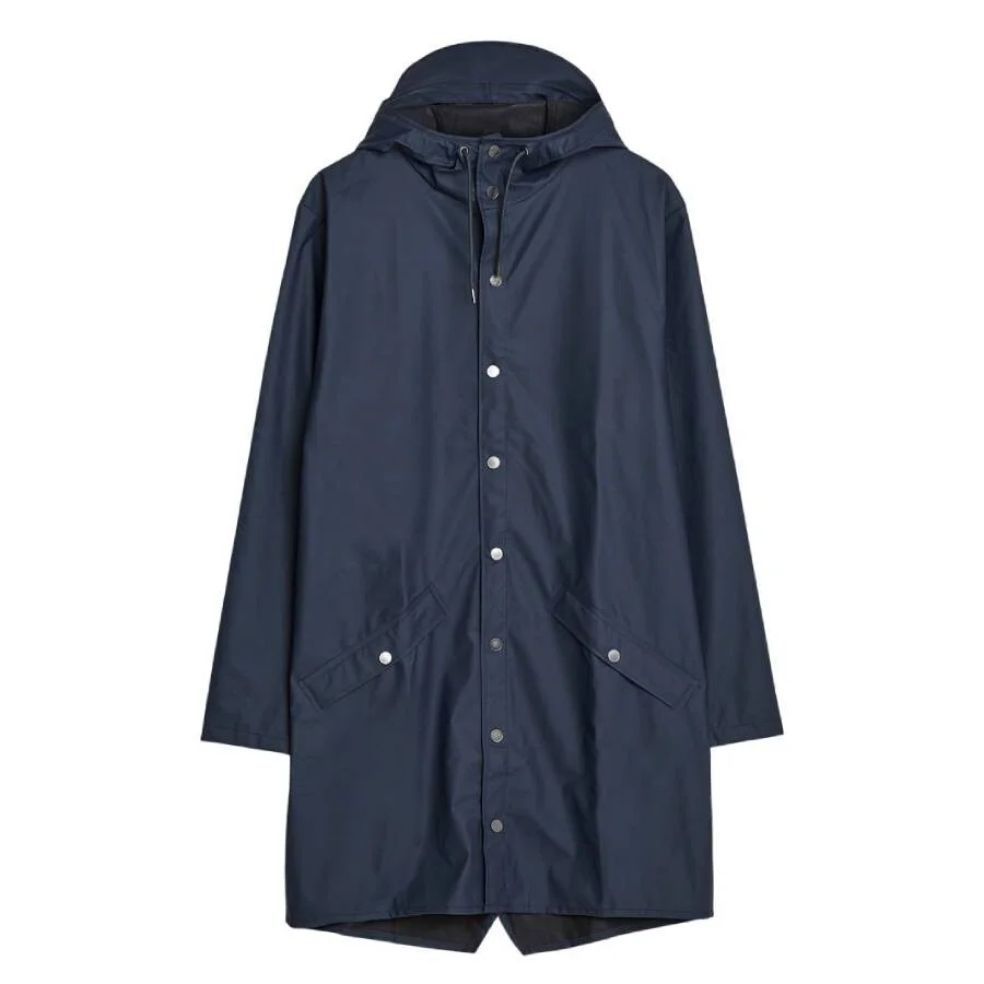 Rains Outerwear. Fashion category: Coats & Jackets. SKU: 12020 NAVY. Color: Navy. Rains Navy Lightweight Waterproof Long Jacket. The Long Jacket features snap fastening, under-arm eyelets, back yoke with concealed vents, double welded slanting flap pockets, adjustable cuffs and a fishtail hem. waterproof, windproof, lightweight, ventilation. 100% polyester with polyurethane coating. GENERAL Color: Navy INFORMATION Brand: Rains Gender: Mens Model: 12020 NAVY DETAILS Category: Outerwear Apparel Type: Coats & Jackets Material: Polyester ADDITIONAL INFO Jomashop Sku: -12020NAVY Department: Clothing