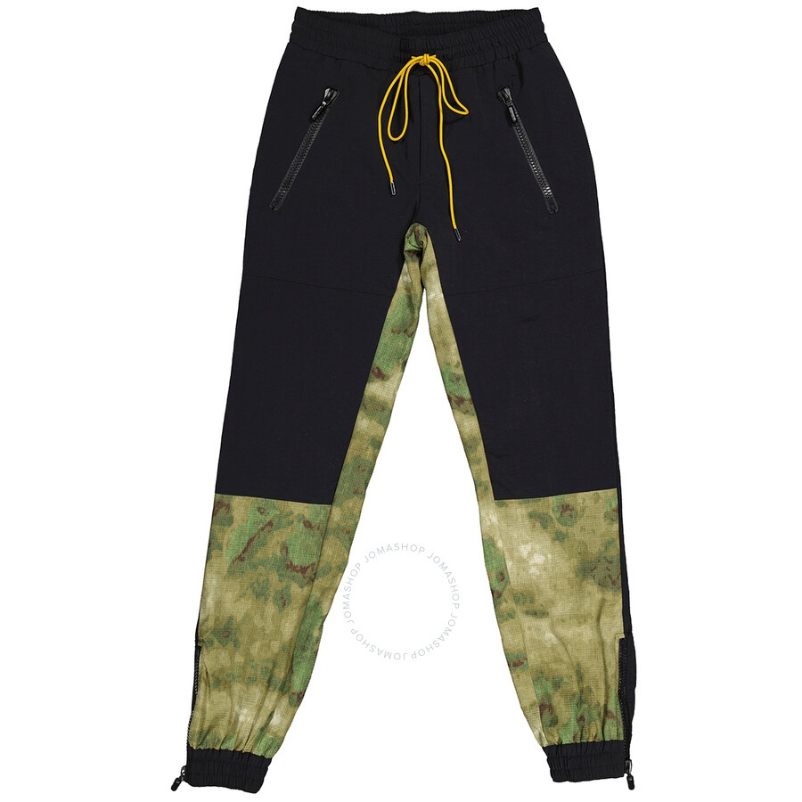 Brand: Rhude. SKU: RHU06PS20053-BLK. Color: Black/Camo. Rhude Black / Camo Nylon Jogger Pants. Rhude nyon jogger pants with technical mesh lining, enriched by camouflage inserts and elasticated waistband with the iconic contrasting drawstring. Relaxed fit, zipped side pockets, patch rear pockets, elasticated zipped cuffs. 100% nylon, 100% poliestere. GENERAL Color: Black/Camo INFORMATION Brand: Rhude Gender: Mens Model: RHU06PS20053-BLK DETAILS Category: Bottoms Apparel Type: Pants & Leggings ADDITIONAL INFO Jomashop Sku: -RHU06PS20053BLK Department: Apparel