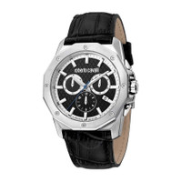 Silver-tone stainless steel case with a black leather strap. Fixed silver-tone stainless steel bezel. Black dial with silver-tone hands and index hour markers. Minute markers around the outer rim. Dial Type: Analog. Luminescent markers. Date display at the 4 o'clock position. Chronograph - three sub-dials displaying: 60 second, 30 minute and 12 hour. Quartz movement. Scratch resistant sapphire crystal. Round case shape, case size: 42 mm. Water resistant at 100 meters / 330 feet. Functions: chronograph, date, hour, minute, second. Fashion Watch Series. Fashion watch style. Watch label: Swiss Made. Roberto Cavalli Fashion Watch Chronograph Quartz Black Dial Men's Watch RV1G170L0011. CASE Case Size: 42 Case Material: Stainless Steel Case Shape: Round BAND Band Material: Leather Band Type: Strap Band Color: Black DIAL Dial Color: Black Type: Analog Crystal: Scratch Resistant Sapphire Hands: Silver-tone Dial Markers: Index Second Markers: Minute Markers around the outer rim Sub Dials: Three - 60 Second, 30 Minute and 12 Hour Luminiscence: Markers Bezel: Fixed Bezel Color: Silver-tone Bezel Material: Stainless Steel INFORMATION Brand: Roberto Cavalli Series: Fashion Watch Collection Name: Fashion Watch Gender: Mens Model: RV1G170L0011 Watch Label: Swiss Made Movement: Quartz FEATURES Water Resistance: 100 meters / 330 feet Calendar: Date display at the 4 o'clock position Functions: Chronograph, Date, Hour, Minute, Second Watch Features: Analog, Leather, Stainless Steel, Chronograph ADDITIONAL INFO Watch Style: Fashion Warranty: With Manufacturers Guarantee UPC Code: 4894626179884 Jomashop Sku: Y-A4GNT Department: Watches