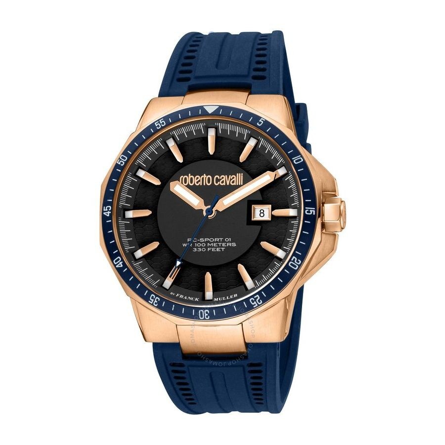 Rose gold-tone stainless steel case with a blue silicone strap. Blue stainless steel bezel. Black dial with rose gold-tone hands and index hour markers. Minute markers around the outer rim. Dial Type: Analog. Luminescent hands and markers. Date display at the 3 o'clock position. Quartz movement. Scratch resistant sapphire crystal. Round case shape, case size: 44 mm. Water resistant at 100 meters / 330 feet. Functions: date, hour, minute, second. Fashion Watch Series. Fashion watch style. Watch label: Swiss Made. Roberto Cavalli Fashion Watch Quartz Black Dial Men's Watch RV1G182P0041. CASE Case Size: 44 Case Material: Stainless Steel Case Shape: Round BAND Band Material: Silicone Band Type: Strap Band Color: Blue DIAL Dial Color: Black Type: Analog Crystal: Scratch Resistant Sapphire Hands: Rose Gold-tone Dial Markers: Index Second Markers: Minute Markers around the outer rim Luminiscence: Hands and Markers Bezel Color: Blue Bezel Material: Stainless Steel INFORMATION Brand: Roberto Cavalli Series: Fashion Watch Collection Name: Fashion Watch Gender: Mens Model: RV1G182P0041 Watch Label: Swiss Made Movement: Quartz FEATURES Water Resistance: 100 meters / 330 feet Calendar: Date display at the 3 o'clock position Functions: Date, Hour, Minute, Second Watch Features: Stainless Steel, Gold, Analog ADDITIONAL INFO Watch Style: Fashion Warranty: With Manufacturers Guarantee UPC Code: 4894626188718 Jomashop Sku: Y-A4GNH Department: Watches
