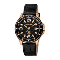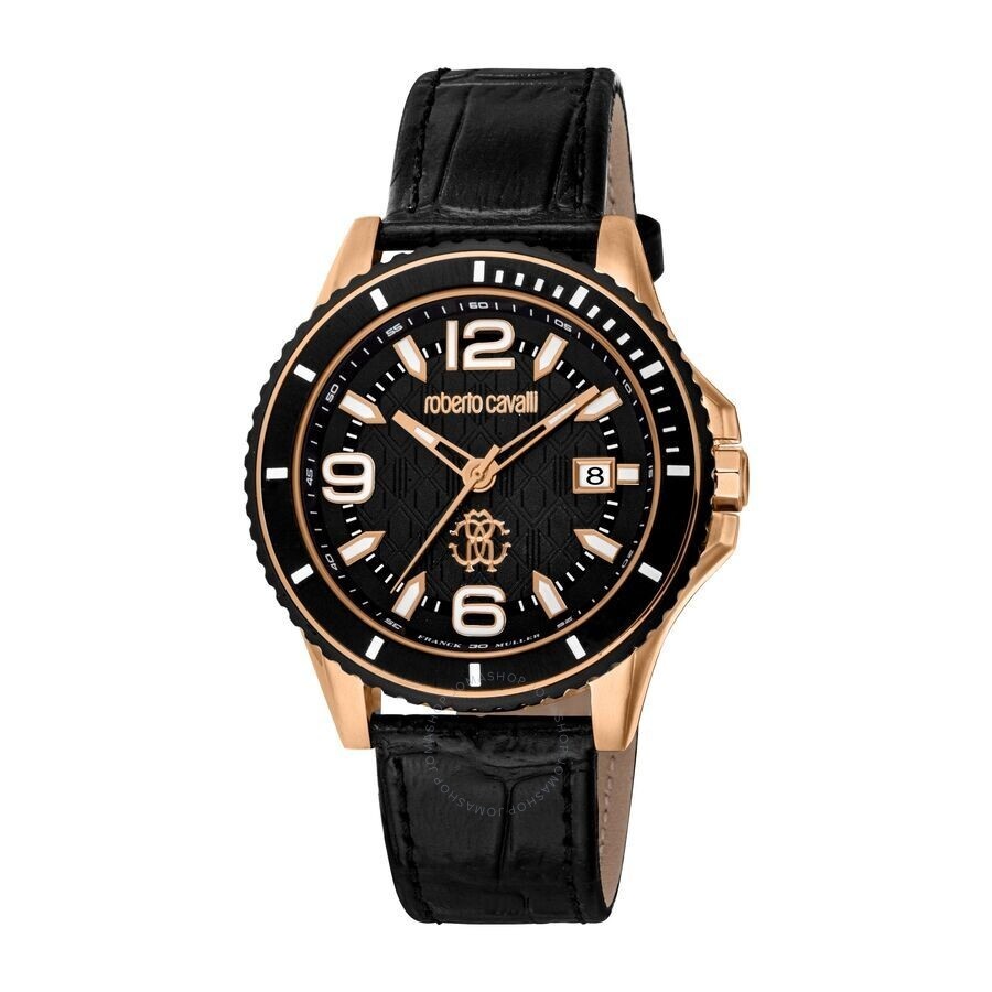 Rose gold-tone stainless steel case with a black leather strap. Black stainless steel bezel. Black dial with rose gold-tone hands and index hour markers. Minute markers around the outer rim. Dial Type: Analog. Luminescent hands and markers. Date display at the 3 o'clock position. Quartz movement. Scratch resistant sapphire crystal. Round case shape, case size: 42 mm. Water resistant at 100 meters / 330 feet. Functions: date, hour, minute, second. Fashion Watch Series. Fashion watch style. Watch label: Swiss Made. Roberto Cavalli Fashion Watch Quartz Black Dial Men's Watch RV1G217L0031. CASE Case Size: 42 Case Material: Stainless Steel Case Shape: Round BAND Band Material: Leather Band Type: Strap Band Color: Black DIAL Dial Color: Black Type: Analog Crystal: Scratch Resistant Sapphire Hands: Rose Gold-tone Dial Markers: Index Second Markers: Minute Markers around the outer rim Luminiscence: Hands and Markers Bezel Color: Black Bezel Material: Stainless Steel INFORMATION Brand: Roberto Cavalli Series: Fashion Watch Collection Name: Fashion Watch Gender: Mens Model: RV1G217L0031 Watch Label: Swiss Made Movement: Quartz FEATURES Water Resistance: 100 meters / 330 feet Calendar: Date display at the 3 o'clock position Functions: Date, Hour, Minute, Second Watch Features: Analog, Gold, Leather, Stainless Steel ADDITIONAL INFO Watch Style: Fashion Warranty: With Manufacturers Guarantee UPC Code: 4894626220463 Jomashop Sku: Y-A4GP5 Department: Watches