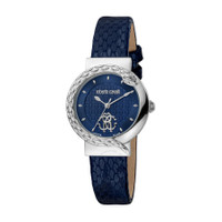 Silver-tone stainless steel case with a blue leather strap. Fixed silver-tone stainless steel bezel. Blue dial with silver-tone hands and index hour markers. Dial Type: Analog. Quartz movement. Scratch resistant sapphire crystal. Round case shape, case size: 30 mm. Water resistant at 50 meters / 165 feet. Functions: hour, minute, second. Fashion Watch Series. Fashion watch style. Watch label: Swiss Made. Roberto Cavalli Fashion Watch Quartz Blue Dial Ladies Watch RV1L156L1021. INFORMATION Brand: Roberto Cavalli Series: Fashion Watch Collection Name: Fashion Watch Gender: Womens Model: RV1L156L1021 Watch Label: Swiss Made Movement: Quartz CASE Case Size: 30 mm Case Material: Stainless Steel Case Shape: Round BAND Band Material: Leather Band Type: Strap Band Color: Blue DIAL Dial Color: Blue Type: Analog Crystal: Scratch Resistant Sapphire Hands: Silver-tone Dial Markers: Index Bezel: Fixed Bezel Color: Silver-tone Bezel Material: Stainless Steel FEATURES Water Resistance: 50 meters / 165 feet Functions: Hour, Minute, Second Watch Features: Stainless Steel, Leather, Analog ADDITIONAL INFO Watch Style: Fashion Warranty: With Manufacturers Guarantee UPC Code: 4894626179259 Jomashop Sku: Y-A4GDX Department: Watches