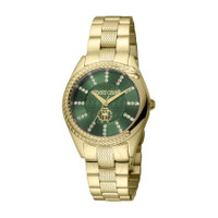 Yellow gold-tone stainless steel case and bracelet. Fixed yellow gold-tone stainless steel bezel. Green dial with yellow gold-tone hands and index hour markers. Dial Type: Analog. Quartz movement. Scratch resistant mineral crystal. Round case shape, case size: 32 mm. Fold over clasp with a safety release. Water resistant at 50 meters / 165 feet. Functions: hour, minute, second. Fashion Watch Series. Fashion watch style. Roberto Cavalli Fashion Watch Quartz Green Dial Ladies Watch RC5L038M0065. INFORMATION Brand: Roberto Cavalli Series: Fashion Watch Collection Name: Fashion Watch Gender: Womens Model: RC5L038M0065 Movement: Quartz CASE Case Size: 32 mm Case Material: Stainless Steel Case Shape: Round BAND Band Material: Stainless Steel Band Type: Bracelet Band Color: Yellow Gold-tone Clasp: Fold Over with Safety Release DIAL Dial Color: Green Type: Analog Crystal: Scratch Resistant Mineral Hands: Yellow Gold-tone Dial Markers: Index Bezel: Fixed Bezel Color: Yellow Gold-tone Bezel Material: Stainless Steel FEATURES Water Resistance: 50 meters / 165 feet Functions: Hour, Minute, Second Watch Features: Stainless Steel, Gold, Analog ADDITIONAL INFO Watch Style: Fashion Warranty: With Manufacturers Guarantee UPC Code: 4894626190001 Jomashop Sku: Y-A4GFW Department: Watches