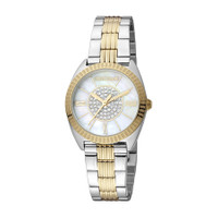 Silver-tone stainless steel case with a two-tone (silver-tone and yellow gold-tone) stainless steel bracelet. Fixed yellow gold-tone stainless steel bezel. Mother of pearl dial with yellow gold-tone hands and index hour markers. Dial Type: Analog. Quartz movement. Scratch resistant mineral crystal. Round case shape, case size: 30 mm. Fold over clasp with a safety release. Water resistant at 50 meters / 165 feet. Functions: hour, minute, second. Fashion Watch Series. Fashion watch style. Roberto Cavalli Fashion Watch Quartz Ladies Watch RC5L022M0085. INFORMATION Brand: Roberto Cavalli Series: Fashion Watch Collection Name: Fashion Watch Gender: Womens Model: RC5L022M0085 Movement: Quartz CASE Case Size: 30 mm Case Material: Stainless Steel Case Shape: Round BAND Band Material: Stainless Steel Band Type: Bracelet Band Color: Two-tone (Silver-tone and Yellow Gold-tone) Clasp: Fold Over with Safety Release DIAL Dial Color: Mother of Pearl Type: Analog Crystal: Scratch Resistant Mineral Hands: Yellow Gold-tone Dial Markers: Index Bezel: Fixed Bezel Color: Yellow Gold-tone Bezel Material: Stainless Steel FEATURES Water Resistance: 50 meters / 165 feet Functions: Hour, Minute, Second Watch Features: Stainless Steel, Gold, Analog ADDITIONAL INFO Watch Style: Fashion Warranty: With Manufacturers Guarantee UPC Code: 4894626178443 Jomashop Sku: Y-A4GL9 Department: Watches