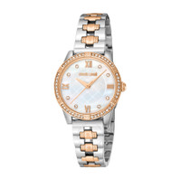 Silver-tone stainless steel case with a two-tone (silver-tone and rose gold-tone) stainless steel bracelet. Fixed rose gold-tone stainless steel bezel. Mother of pearl dial with rose gold-tone hands and index hour markers. Dial Type: Analog. Quartz movement. Scratch resistant mineral crystal. Round case shape, case size: 30 mm. Fold over clasp with a safety release. Water resistant at 50 meters / 165 feet. Functions: hour, minute, second. Fashion Watch Series. Fashion watch style. Roberto Cavalli Fashion Watch Quartz Ladies Watch RC5L032M0105. INFORMATION Brand: Roberto Cavalli Series: Fashion Watch Collection Name: Fashion Watch Gender: Womens Model: RC5L032M0105 Movement: Quartz CASE Case Size: 30 mm Case Material: Stainless Steel Case Shape: Round BAND Band Material: Stainless Steel Band Type: Bracelet Band Color: Two-tone (Silver-tone and Rose Gold-tone) Clasp: Fold Over with Safety Release DIAL Dial Color: Mother of Pearl Type: Analog Crystal: Scratch Resistant Mineral Hands: Rose Gold-tone Dial Markers: Index Bezel: Fixed Bezel Color: Rose Gold-tone Bezel Material: Stainless Steel FEATURES Water Resistance: 50 meters / 165 feet Functions: Hour, Minute, Second Watch Features: Stainless Steel, Gold, Analog ADDITIONAL INFO Watch Style: Fashion Warranty: With Manufacturers Guarantee UPC Code: 4894626219078 Jomashop Sku: Y-A4GJH Department: Watches