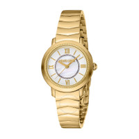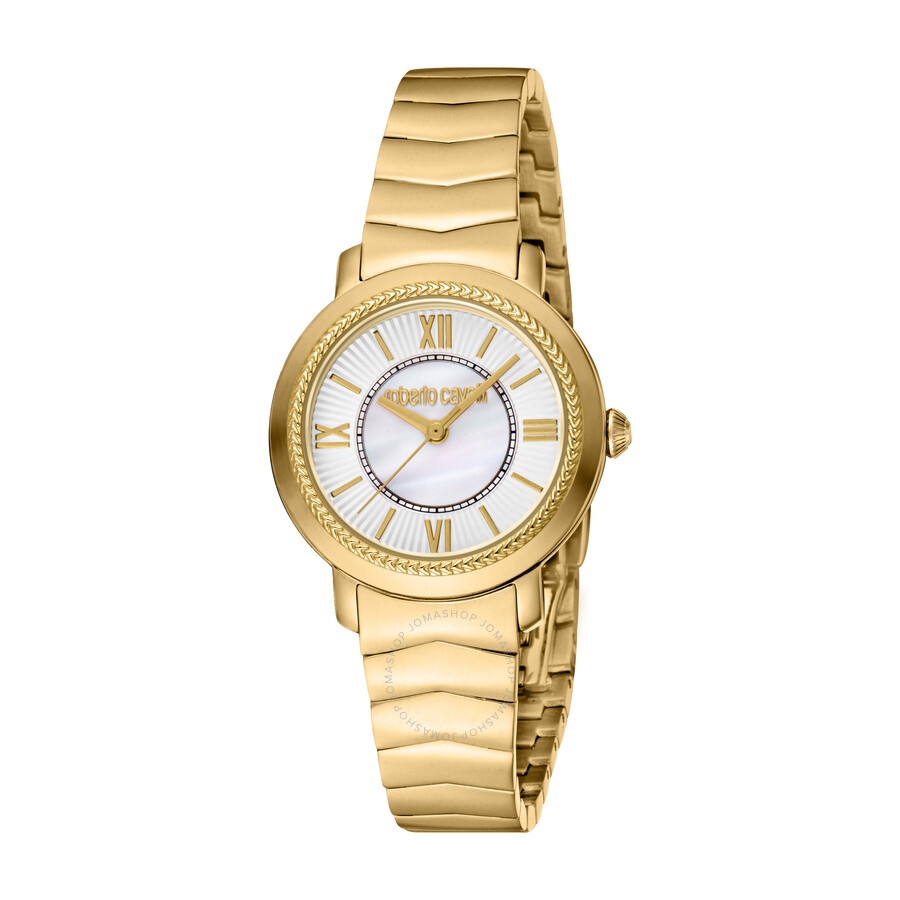 Yellow gold-tone stainless steel case and bracelet. Fixed yellow gold-tone stainless steel bezel. Mother of pearl dial with yellow gold-tone hands and index hour markers. Dial Type: Analog. Quartz movement. Scratch resistant mineral crystal. Round case shape, case size: 30 mm. Fold over clasp with a safety release. Water resistant at 50 meters / 165 feet. Functions: hour, minute, second. Fashion Watch Series. Fashion watch style. Roberto Cavalli Fashion Watch Quartz Ladies Watch RC5L056M0055. INFORMATION Brand: Roberto Cavalli Series: Fashion Watch Collection Name: Fashion Watch Gender: Womens Model: RC5L056M0055 Movement: Quartz CASE Case Size: 30 mm Case Material: Stainless Steel Case Shape: Round BAND Band Material: Stainless Steel Band Type: Bracelet Band Color: Yellow Gold-tone Clasp: Fold Over with Safety Release DIAL Dial Color: Mother of Pearl Type: Analog Crystal: Scratch Resistant Mineral Hands: Yellow Gold-tone Dial Markers: Index Bezel: Fixed Bezel Color: Yellow Gold-tone Bezel Material: Stainless Steel FEATURES Water Resistance: 50 meters / 165 feet Functions: Hour, Minute, Second Watch Features: Stainless Steel, Gold, Analog ADDITIONAL INFO Watch Style: Fashion Warranty: With Manufacturers Guarantee UPC Code: 4894626219276 Jomashop Sku: Y-A4GLY Department: Watches