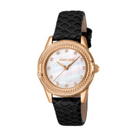 Rose gold-tone stainless steel case with a black leather strap. Fixed rose gold-tone stainless steel bezel. Mother of pearl dial with rose gold-tone hands and index hour markers. Dial Type: Analog. Quartz movement. Scratch resistant mineral crystal. Round case shape, case size: 32 mm. Water resistant at 50 meters / 165 feet. Functions: hour, minute, second. Fashion Watch Series. Fashion watch style. Roberto Cavalli Fashion Watch Quartz Ladies Watch RC5L063L0035. INFORMATION Brand: Roberto Cavalli Series: Fashion Watch Collection Name: Fashion Watch Gender: Womens Model: RC5L063L0035 Movement: Quartz CASE Case Size: 32 mm Case Material: Stainless Steel Case Shape: Round BAND Band Material: Leather Band Type: Strap Band Color: Black DIAL Dial Color: Mother of Pearl Type: Analog Crystal: Scratch Resistant Mineral Hands: Rose Gold-tone Dial Markers: Index Bezel: Fixed Bezel Color: Rose Gold-tone Bezel Material: Stainless Steel FEATURES Water Resistance: 50 meters / 165 feet Functions: Hour, Minute, Second Watch Features: Stainless Steel, Leather, Gold, Analog ADDITIONAL INFO Watch Style: Fashion Warranty: With Manufacturers Guarantee UPC Code: 4894626219535 Jomashop Sku: Y-A4GK7 Department: Watches