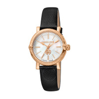 Rose gold-tone stainless steel case with a black leather strap. Fixed rose gold-tone stainless steel bezel. Mother of pearl dial with rose gold-tone hands and index hour markers. Minute markers around the outer rim. Dial Type: Analog. Quartz movement. Scratch resistant sapphire crystal. Round case shape, case size: 30 mm. Water resistant at 50 meters / 165 feet. Functions: hour, minute, second. Fashion Watch Series. Fashion watch style. Watch label: Swiss Made. Roberto Cavalli Fashion Watch Quartz Ladies Watch RV1L193L0031. INFORMATION Brand: Roberto Cavalli Series: Fashion Watch Collection Name: Fashion Watch Gender: Womens Model: RV1L193L0031 Watch Label: Swiss Made Movement: Quartz CASE Case Size: 30 mm Case Material: Stainless Steel Case Shape: Round BAND Band Material: Leather Band Type: Strap Band Color: Black DIAL Dial Color: Mother of Pearl Type: Analog Crystal: Scratch Resistant Sapphire Hands: Rose Gold-tone Dial Markers: Index Second Markers: Minute Markers around the outer rim Bezel: Fixed Bezel Color: Rose Gold-tone Bezel Material: Stainless Steel FEATURES Water Resistance: 50 meters / 165 feet Functions: Hour, Minute, Second Watch Features: Stainless Steel, Leather, Gold, Analog ADDITIONAL INFO Watch Style: Fashion Warranty: With Manufacturers Guarantee UPC Code: 4894626179167 Jomashop Sku: Y-A4GKA Department: Watches