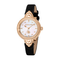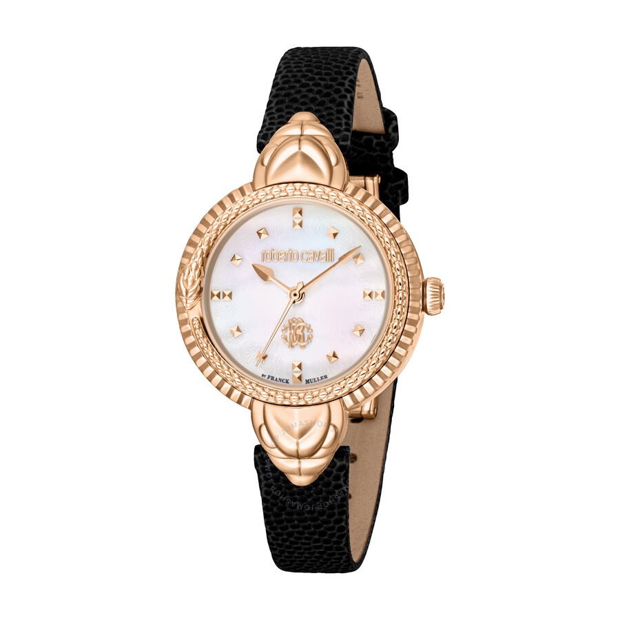 Rose gold-tone stainless steel case with a black leather strap. Fixed rose gold-tone stainless steel bezel. Mother of pearl dial with rose gold-tone hands and index hour markers. Dial Type: Analog. Quartz movement. Scratch resistant sapphire crystal. Round case shape, case size: 32 mm. Water resistant at 50 meters / 165 feet. Functions: hour, minute, second. Fashion Watch Series. Fashion watch style. Watch label: Swiss Made. Roberto Cavalli Fashion Watch Quartz Ladies Watch RV1L203L0031. INFORMATION Brand: Roberto Cavalli Series: Fashion Watch Collection Name: Fashion Watch Gender: Womens Model: RV1L203L0031 Watch Label: Swiss Made Movement: Quartz CASE Case Size: 32 mm Case Material: Stainless Steel Case Shape: Round BAND Band Material: Leather Band Type: Strap Band Color: Black DIAL Dial Color: Mother of Pearl Type: Analog Crystal: Scratch Resistant Sapphire Hands: Rose Gold-tone Dial Markers: Index Bezel: Fixed Bezel Color: Rose Gold-tone Bezel Material: Stainless Steel FEATURES Water Resistance: 50 meters / 165 feet Functions: Hour, Minute, Second Watch Features: Stainless Steel, Leather, Gold, Analog ADDITIONAL INFO Watch Style: Fashion Warranty: With Manufacturers Guarantee UPC Code: 4894626220043 Jomashop Sku: Y-A4GCW Department: Watches