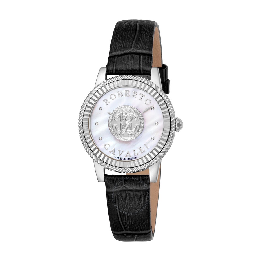Silver-tone stainless steel case with a black leather strap. Fixed silver-tone stainless steel bezel. Mother of pearl dial with silver-tone hands and index hour markers. Dial Type: Analog. Quartz movement. Scratch resistant sapphire crystal. Round case shape, case size: 30 mm. Water resistant at 50 meters / 165 feet. Functions: hour, minute. Fashion Watch Series. Fashion watch style. Watch label: Swiss Made. Roberto Cavalli Fashion Watch Quartz Ladies Watch RV1L228L0011. INFORMATION Brand: Roberto Cavalli Series: Fashion Watch Collection Name: Fashion Watch Gender: Womens Model: RV1L228L0011 Watch Label: Swiss Made Movement: Quartz CASE Case Size: 30 mm Case Material: Stainless Steel Case Shape: Round BAND Band Material: Leather Band Type: Strap Band Color: Black DIAL Dial Color: Mother of Pearl Type: Analog Crystal: Scratch Resistant Sapphire Hands: Silver-tone Dial Markers: Index Bezel: Fixed Bezel Color: Silver-tone Bezel Material: Stainless Steel FEATURES Water Resistance: 50 meters / 165 feet Functions: Hour, Minute Watch Features: Stainless Steel, Leather, Analog ADDITIONAL INFO Watch Style: Fashion Warranty: With Manufacturers Guarantee UPC Code: 4894626232930 Jomashop Sku: Y-A4GK9 Department: Watches