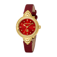 Yellow gold-tone stainless steel case with a red leather strap. Fixed yellow gold-tone stainless steel bezel. Red dial with yellow gold-tone hands and index hour markers. Dial Type: Analog. Quartz movement. Scratch resistant sapphire crystal. Round case shape, case size: 32 mm. Water resistant at 50 meters / 165 feet. Functions: hour, minute, second. Fashion Watch Series. Fashion watch style. Watch label: Swiss Made. Roberto Cavalli Fashion Watch Quartz Red Dial Ladies Watch RV1L203L0021. INFORMATION Brand: Roberto Cavalli Series: Fashion Watch Collection Name: Fashion Watch Gender: Womens Model: RV1L203L0021 Watch Label: Swiss Made Movement: Quartz CASE Case Size: 32 mm Case Material: Stainless Steel Case Shape: Round BAND Band Material: Leather Band Type: Strap Band Color: Red DIAL Dial Color: Red Type: Analog Crystal: Scratch Resistant Sapphire Hands: Yellow Gold-tone Dial Markers: Index Bezel: Fixed Bezel Color: Yellow Gold-tone Bezel Material: Stainless Steel FEATURES Water Resistance: 50 meters / 165 feet Functions: Hour, Minute, Second Watch Features: Stainless Steel, Leather, Gold, Analog ADDITIONAL INFO Watch Style: Fashion Warranty: With Manufacturers Guarantee UPC Code: 4894626220036 Jomashop Sku: Y-A4GF5 Department: Watches