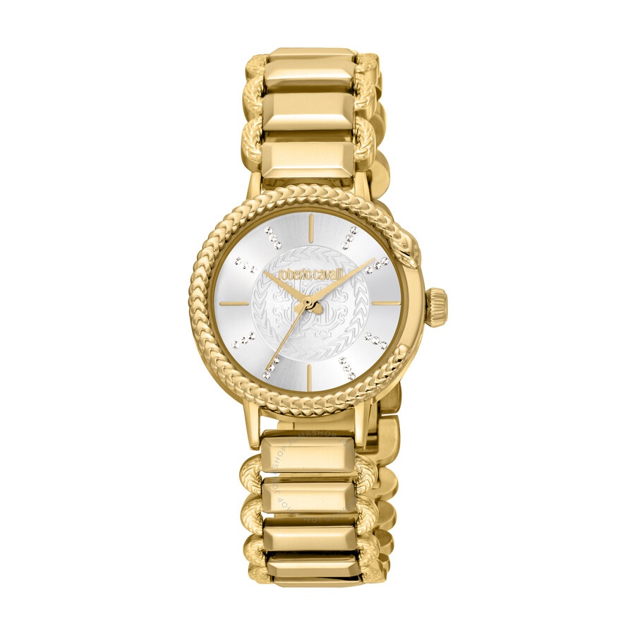 Yellow gold-tone stainless steel case and bracelet. Fixed yellow gold-tone stainless steel bezel. Silver-tone dial with yellow gold-tone hands and index hour markers. Dial Type: Analog. Quartz movement. Scratch resistant mineral crystal. Round case shape, case size: 30 mm. Fold over clasp with a safety release. Water resistant at 50 meters / 165 feet. Functions: hour, minute, second. Fashion Watch Series. Fashion watch style. Roberto Cavalli Fashion Watch Quartz Silver Dial Ladies Watch RC5L020M0055. INFORMATION Brand: Roberto Cavalli Series: Fashion Watch Collection Name: Fashion Watch Gender: Womens Model: RC5L020M0055 Movement: Quartz CASE Case Size: 30 mm Case Material: Stainless Steel Case Shape: Round BAND Band Material: Stainless Steel Band Type: Bracelet Band Color: Yellow Gold-tone Clasp: Fold Over with Safety Release DIAL Dial Color: Silver-tone Type: Analog Crystal: Scratch Resistant Mineral Hands: Yellow Gold-tone Dial Markers: Index Bezel: Fixed Bezel Color: Yellow Gold-tone Bezel Material: Stainless Steel FEATURES Water Resistance: 50 meters / 165 feet Functions: Hour, Minute, Second Watch Features: Stainless Steel, Gold, Analog ADDITIONAL INFO Watch Style: Fashion Warranty: With Manufacturers Guarantee UPC Code: 4894626218828 Jomashop Sku: Y-A4GF2 Department: Watches