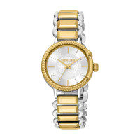 Silver-tone stainless steel case with a two-tone (silver-tone and yellow gold-tone) stainless steel bracelet. Fixed yellow gold-tone stainless steel bezel. Silver-tone dial with yellow gold-tone hands and index hour markers. Dial Type: Analog. Quartz movement. Scratch resistant mineral crystal. Round case shape, case size: 30 mm. Fold over clasp with a safety release. Water resistant at 50 meters / 165 feet. Functions: hour, minute, second. Fashion Watch Series. Fashion watch style. Roberto Cavalli Fashion Watch Quartz Silver Dial Ladies Watch RC5L020M0085. INFORMATION Brand: Roberto Cavalli Series: Fashion Watch Collection Name: Fashion Watch Gender: Womens Model: RC5L020M0085 Movement: Quartz CASE Case Size: 30 mm Case Material: Stainless Steel Case Shape: Round BAND Band Material: Stainless Steel Band Type: Bracelet Band Color: Two-tone (Silver-tone and Yellow Gold-tone) Clasp: Fold Over with Safety Release DIAL Dial Color: Silver-tone Type: Analog Crystal: Scratch Resistant Mineral Hands: Yellow Gold-tone Dial Markers: Index Bezel: Fixed Bezel Color: Yellow Gold-tone Bezel Material: Stainless Steel FEATURES Water Resistance: 50 meters / 165 feet Functions: Hour, Minute, Second Watch Features: Stainless Steel, Gold, Analog ADDITIONAL INFO Watch Style: Fashion Warranty: With Manufacturers Guarantee UPC Code: 4894626218859 Jomashop Sku: Y-A4GME Department: Watches