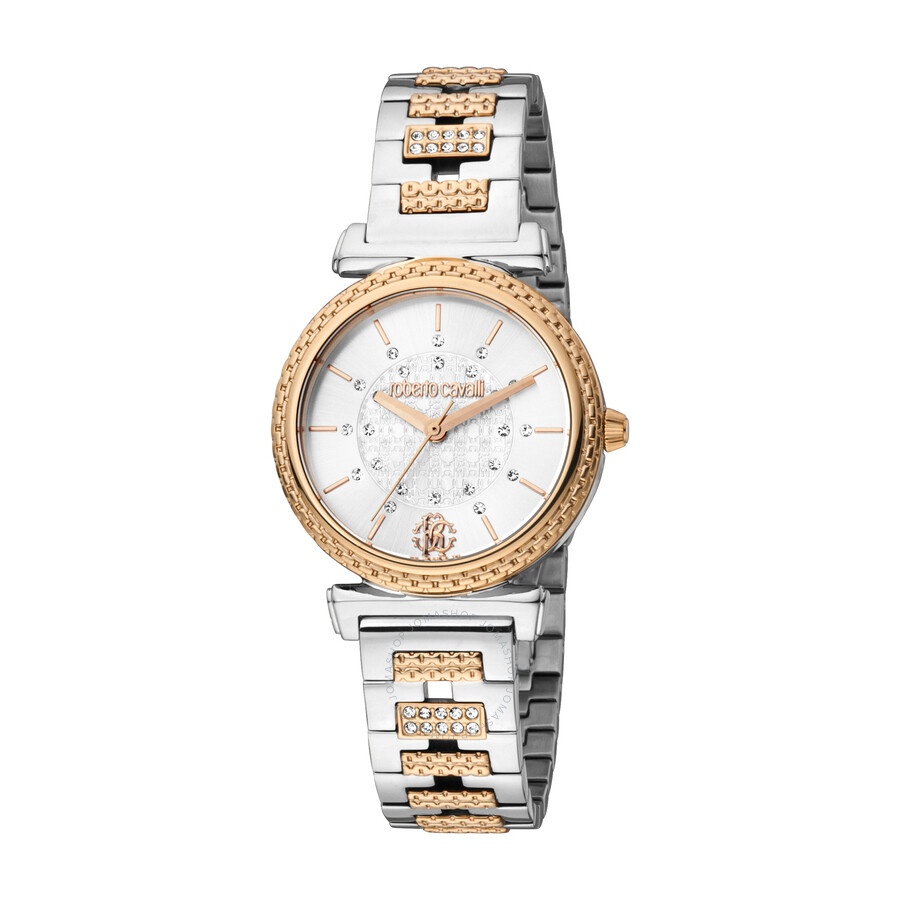 Silver-tone stainless steel case with a two-tone (silver-tone and rose gold-tone) stainless steel bracelet. Fixed rose gold-tone stainless steel bezel. Silver-tone dial with rose gold-tone hands and index hour markers. Dial Type: Analog. Quartz movement. Scratch resistant mineral crystal. Round case shape, case size: 30 mm. Fold over clasp with a safety release. Water resistant at 50 meters / 165 feet. Functions: hour, minute, second. Fashion Watch Series. Fashion watch style. Roberto Cavalli Fashion Watch Quartz Silver Dial Ladies Watch RC5L025M0095. INFORMATION Brand: Roberto Cavalli Series: Fashion Watch Collection Name: Fashion Watch Gender: Womens Model: RC5L025M0095 Movement: Quartz CASE Case Size: 30 mm Case Material: Stainless Steel Case Shape: Round BAND Band Material: Stainless Steel Band Type: Bracelet Band Color: Two-tone (Silver-tone and Rose Gold-tone) Clasp: Fold Over with Safety Release DIAL Dial Color: Silver-tone Type: Analog Crystal: Scratch Resistant Mineral Hands: Rose Gold-tone Dial Markers: Index Bezel: Fixed Bezel Color: Rose Gold-tone Bezel Material: Stainless Steel FEATURES Water Resistance: 50 meters / 165 feet Functions: Hour, Minute, Second Watch Features: Stainless Steel, Gold, Analog ADDITIONAL INFO Watch Style: Fashion Warranty: With Manufacturers Guarantee UPC Code: 4894626177897 Jomashop Sku: Y-A4GKX Department: Watches