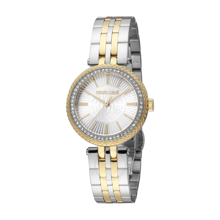 Silver-tone stainless steel case with a two-tone (silver-tone and yellow gold-tone) stainless steel bracelet. Fixed yellow gold-tone stainless steel bezel. Silver-tone dial with yellow gold-tone hands and index hour markers. Dial Type: Analog. Quartz movement. Scratch resistant mineral crystal. Case size: 30 mm. Fold over clasp with a safety release. Water resistant at 50 meters / 165 feet. Functions: hour, minute, second. Fashion Watch Series. Fashion watch style. Roberto Cavalli Fashion Watch Quartz Silver Dial Ladies Watch RC5L031M0085. INFORMATION Brand: Roberto Cavalli Series: Fashion Watch Collection Name: Fashion Watch Gender: Womens Model: RC5L031M0085 Movement: Quartz CASE Case Size: 30 mm Case Material: Stainless Steel BAND Band Material: Stainless Steel Band Type: Bracelet Band Color: Two-tone (Silver-tone and Yellow Gold-tone) Clasp: Fold Over with Safety Release DIAL Dial Color: Silver-tone Type: Analog Crystal: Scratch Resistant Mineral Hands: Yellow Gold-tone Dial Markers: Index Bezel: Fixed Bezel Color: Yellow Gold-tone Bezel Material: Stainless Steel FEATURES Water Resistance: 50 meters / 165 feet Functions: Hour, Minute, Second Watch Features: Stainless Steel, Gold, Analog ADDITIONAL INFO Watch Style: Fashion Warranty: With Manufacturers Guarantee UPC Code: 4894626190285 Jomashop Sku: Y-A4GEZ Department: Watches