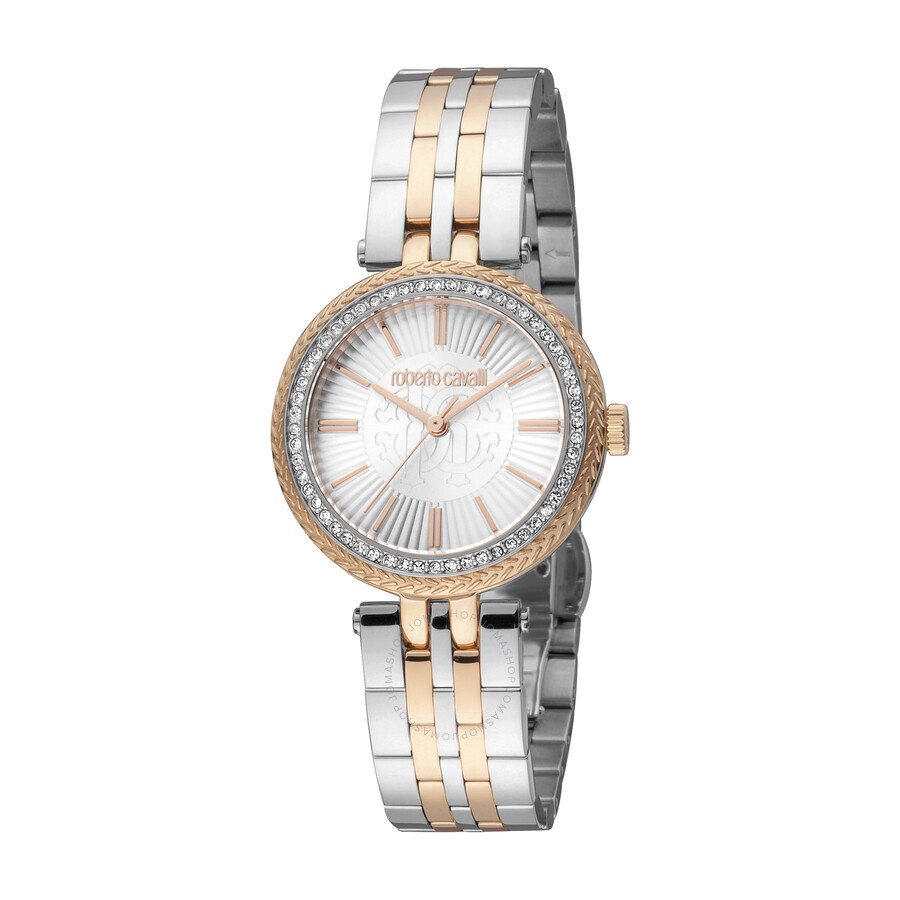 Silver-tone stainless steel case with a two-tone (silver-tone and rose gold-tone) stainless steel bracelet. Fixed rose gold-tone stainless steel bezel. Silver-tone dial with rose gold-tone hands and index hour markers. Dial Type: Analog. Quartz movement. Scratch resistant mineral crystal. Round case shape, case size: 30 mm. Fold over clasp with a safety release. Water resistant at 50 meters / 165 feet. Functions: hour, minute, second. Fashion Watch Series. Fashion watch style. Roberto Cavalli Fashion Watch Quartz Silver Dial Ladies Watch RC5L031M0105. INFORMATION Brand: Roberto Cavalli Series: Fashion Watch Collection Name: Fashion Watch Gender: Womens Model: RC5L031M0105 Movement: Quartz CASE Case Size: 30 mm Case Material: Stainless Steel Case Shape: Round BAND Band Material: Stainless Steel Band Type: Bracelet Band Color: Two-tone (Silver-tone and Rose Gold-tone) Clasp: Fold Over with Safety Release DIAL Dial Color: Silver-tone Type: Analog Crystal: Scratch Resistant Mineral Hands: Rose Gold-tone Dial Markers: Index Bezel: Fixed Bezel Color: Rose Gold-tone Bezel Material: Stainless Steel FEATURES Water Resistance: 50 meters / 165 feet Functions: Hour, Minute, Second Watch Features: Stainless Steel, Gold, Analog ADDITIONAL INFO Watch Style: Fashion Warranty: With Manufacturers Guarantee UPC Code: 4894626190308 Jomashop Sku: Y-A4GFY Department: Watches