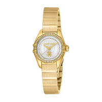 Yellow gold-tone stainless steel case and bracelet. Fixed yellow gold-tone stainless steel bezel. Silver-tone dial with yellow gold-tone hands and index hour markers. Minute markers around the outer rim. Dial Type: Analog. Quartz movement. Scratch resistant mineral crystal. Round case shape, case size: 26 mm. Fold over clasp with a safety release. Water resistant at 50 meters / 165 feet. Functions: hour, minute, second. Fashion Watch Series. Fashion watch style. Roberto Cavalli Fashion Watch Quartz Silver Dial Ladies Watch RC5L054M0055. INFORMATION Brand: Roberto Cavalli Series: Fashion Watch Collection Name: Fashion Watch Gender: Womens Model: RC5L054M0055 Movement: Quartz CASE Case Size: 26 mm Case Material: Stainless Steel Case Shape: Round BAND Band Material: Stainless Steel Band Type: Bracelet Band Color: Yellow Gold-tone Clasp: Fold Over with Safety Release DIAL Dial Color: Silver-tone Type: Analog Crystal: Scratch Resistant Mineral Hands: Yellow Gold-tone Dial Markers: Index Second Markers: Minute Markers around the outer rim Bezel: Fixed Bezel Color: Yellow Gold-tone Bezel Material: Stainless Steel FEATURES Water Resistance: 50 meters / 165 feet Functions: Hour, Minute, Second Watch Features: Stainless Steel, Gold, Analog ADDITIONAL INFO Watch Style: Fashion Warranty: With Manufacturers Guarantee UPC Code: 4894626219184 Jomashop Sku: Y-A4GGJ Department: Watches