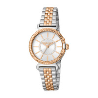 Silver-tone stainless steel case with a two-tone (silver-tone and rose gold-tone) stainless steel bracelet. Fixed rose gold-tone stainless steel bezel. Silver-tone dial with rose gold-tone hands and index hour markers. Dial Type: Analog. Quartz movement. Scratch resistant mineral crystal. Round case shape, case size: 30 mm. Fold over clasp with a safety release. Water resistant at 50 meters / 165 feet. Functions: hour, minute, second. Fashion Watch Series. Fashion watch style. Roberto Cavalli Fashion Watch Quartz Silver Dial Ladies Watch RC5L061M0095. INFORMATION Brand: Roberto Cavalli Series: Fashion Watch Collection Name: Fashion Watch Gender: Womens Model: RC5L061M0095 Movement: Quartz CASE Case Size: 30 mm Case Material: Stainless Steel Case Shape: Round BAND Band Material: Stainless Steel Band Type: Bracelet Band Color: Two-tone (Silver-tone and Rose Gold-tone) Clasp: Fold Over with Safety Release DIAL Dial Color: Silver-tone Type: Analog Crystal: Scratch Resistant Mineral Hands: Rose Gold-tone Dial Markers: Index Bezel: Fixed Bezel Color: Rose Gold-tone Bezel Material: Stainless Steel FEATURES Water Resistance: 50 meters / 165 feet Functions: Hour, Minute, Second Watch Features: Stainless Steel, Gold, Analog ADDITIONAL INFO Watch Style: Fashion Warranty: With Manufacturers Guarantee UPC Code: 4894626219504 Jomashop Sku: Y-A4GJV Department: Watches