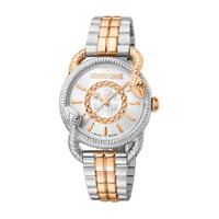 Silver-tone stainless steel case with a two-tone (silver-tone and rose gold-tone) stainless steel bracelet. Fixed silver-tone stainless steel bezel. Silver-tone dial with rose gold-tone hands and index hour markers. Dial Type: Analog. Quartz movement. Scratch resistant sapphire crystal. Round case shape, case size: 34 mm. Fold over clasp with a safety release. Water resistant at 50 meters / 165 feet. Functions: hour, minute, second. Fashion Watch Series. Fashion watch style. Watch label: Swiss Made. Roberto Cavalli Fashion Watch Quartz Silver Dial Ladies Watch RV1L126M1071. INFORMATION Brand: Roberto Cavalli Series: Fashion Watch Collection Name: Fashion Watch Gender: Womens Model: RV1L126M1071 Watch Label: Swiss Made Movement: Quartz CASE Case Size: 34 mm Case Material: Stainless Steel Case Shape: Round BAND Band Material: Stainless Steel Band Type: Bracelet Band Color: Two-tone (Silver-tone and Rose Gold-tone) Clasp: Fold Over with Safety Release DIAL Dial Color: Silver-tone Type: Analog Crystal: Scratch Resistant Sapphire Hands: Rose Gold-tone Dial Markers: Index Bezel: Fixed Bezel Color: Silver-tone Bezel Material: Stainless Steel FEATURES Water Resistance: 50 meters / 165 feet Functions: Hour, Minute, Second Watch Features: Stainless Steel, Gold, Analog ADDITIONAL INFO Watch Style: Fashion Warranty: With Manufacturers Guarantee UPC Code: 4894626179419 Jomashop Sku: Y-A4GGX Department: Watches
