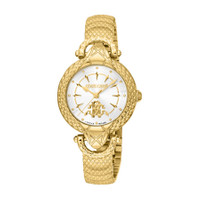 Yellow gold-tone stainless steel case and bracelet. Fixed yellow gold-tone stainless steel bezel. Silver-tone dial with yellow gold-tone hands and index hour markers. Dial Type: Analog. Quartz movement. Scratch resistant sapphire crystal. Round case shape, case size: 32 mm. Fold over clasp with a safety release. Water resistant at 50 meters / 165 feet. Functions: hour, minute, second. Fashion Watch Series. Fashion watch style. Watch label: Swiss Made. Roberto Cavalli Fashion Watch Quartz Silver Dial Ladies Watch RV1L165M0051. INFORMATION Brand: Roberto Cavalli Series: Fashion Watch Collection Name: Fashion Watch Gender: Womens Model: RV1L165M0051 Watch Label: Swiss Made Movement: Quartz CASE Case Size: 32 mm Case Material: Stainless Steel Case Shape: Round BAND Band Material: Stainless Steel Band Type: Bracelet Band Color: Yellow Gold-tone Clasp: Fold Over with Safety Release DIAL Dial Color: Silver-tone Type: Analog Crystal: Scratch Resistant Sapphire Hands: Yellow Gold-tone Dial Markers: Index Bezel: Fixed Bezel Color: Yellow Gold-tone Bezel Material: Stainless Steel FEATURES Water Resistance: 50 meters / 165 feet Functions: Hour, Minute, Second Watch Features: Stainless Steel, Gold, Analog ADDITIONAL INFO Watch Style: Fashion Warranty: With Manufacturers Guarantee UPC Code: 4894626219962 Jomashop Sku: Y-A4GGS Department: Watches