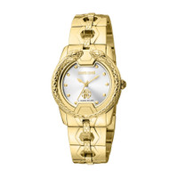 Yellow gold-tone stainless steel case and bracelet. Fixed yellow gold-tone stainless steel bezel. Silver-tone dial with yellow gold-tone hands and index hour markers. Dial Type: Analog. Quartz movement. Scratch resistant sapphire crystal. Round case shape, case size: 32 mm. Fold over clasp with a safety release. Water resistant at 50 meters / 165 feet. Functions: hour, minute, second. Fashion Watch Series. Fashion watch style. Watch label: Swiss Made. Roberto Cavalli Fashion Watch Quartz Silver Dial Ladies Watch RV1L168M0021. INFORMATION Brand: Roberto Cavalli Series: Fashion Watch Collection Name: Fashion Watch Gender: Womens Model: RV1L168M0021 Watch Label: Swiss Made Movement: Quartz CASE Case Size: 32 mm Case Material: Stainless Steel Case Shape: Round BAND Band Material: Stainless Steel Band Type: Bracelet Band Color: Yellow Gold-tone Clasp: Fold Over with Safety Release DIAL Dial Color: Silver-tone Type: Analog Crystal: Scratch Resistant Sapphire Hands: Yellow Gold-tone Dial Markers: Index Bezel: Fixed Bezel Color: Yellow Gold-tone Bezel Material: Stainless Steel FEATURES Water Resistance: 50 meters / 165 feet Functions: Hour, Minute, Second Watch Features: Stainless Steel, Gold, Analog ADDITIONAL INFO Watch Style: Fashion Warranty: With Manufacturers Guarantee UPC Code: 4894626187988 Jomashop Sku: Y-A4GFM Department: Watches